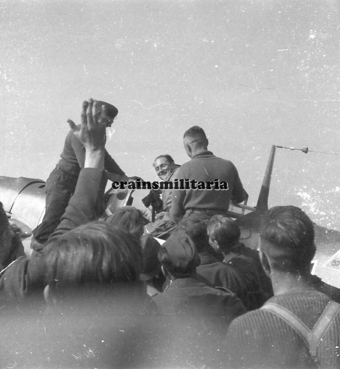 Pilot der II./Jagdgeschwader 2 nach Luftsieg im Westfeldzug in Messerschmitt Bf109E, und Treffen mit seiner Kommandeur, Major Wolfgang Schellmann (RK!).