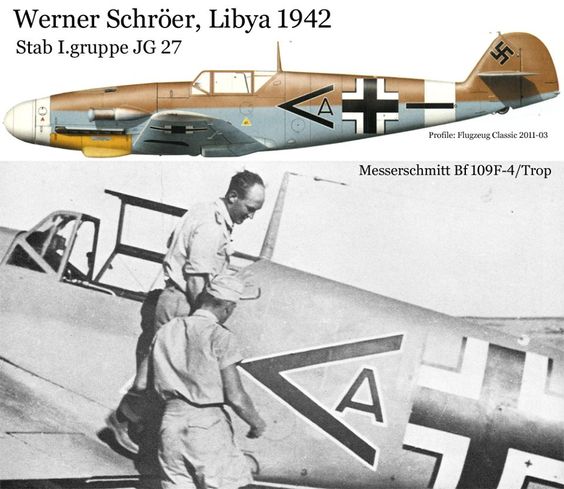 1. Messerschmitt Bf 109F-4/Trop Stab 1./JG 27 Werner Schroer. Libya 1942. 2. Messerschmitt Bf 109E-4 JG27. 1941.