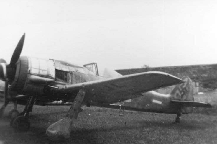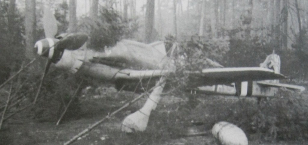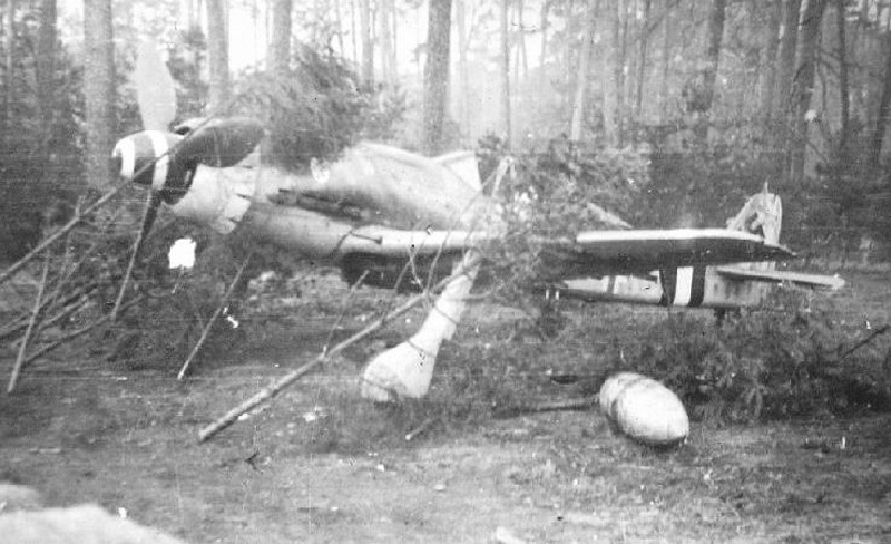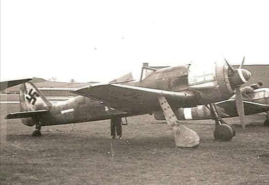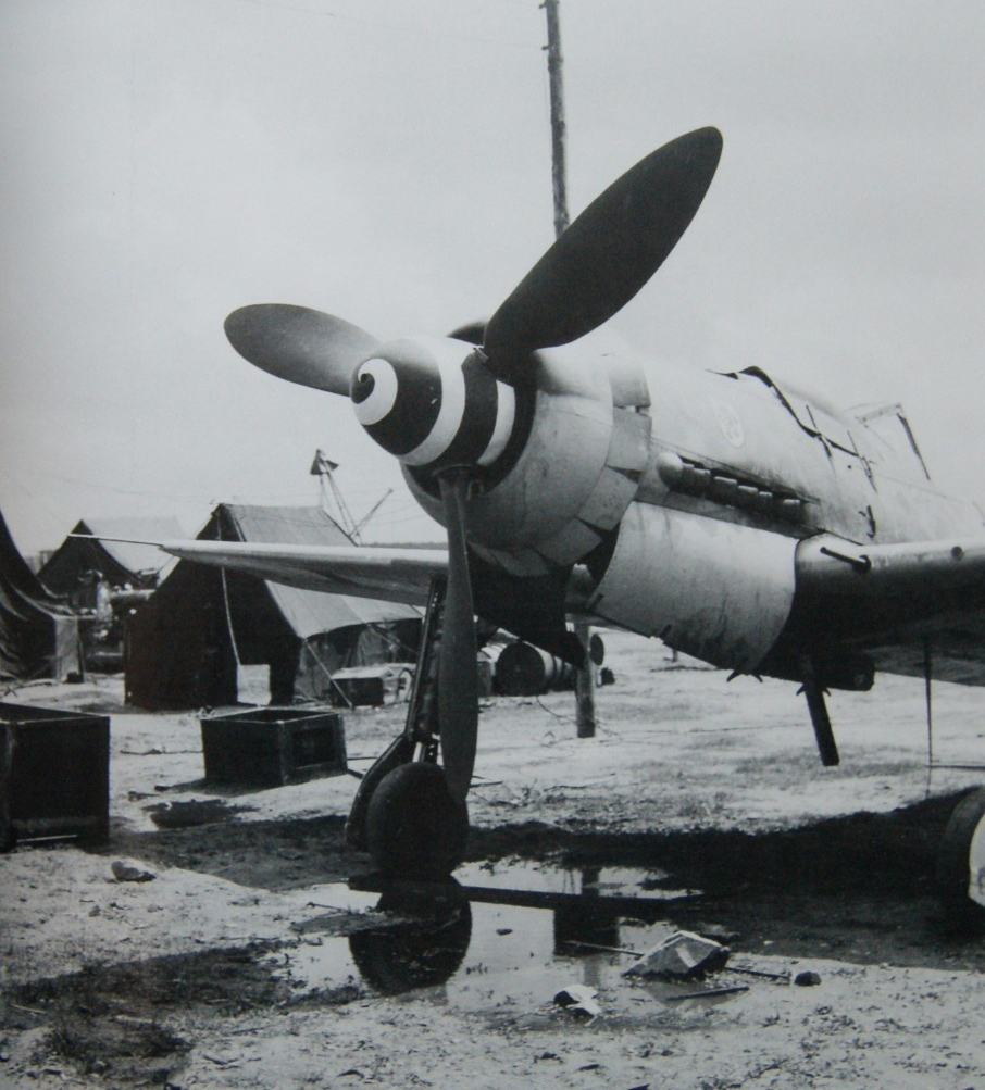 Отличный комментарий)) Fw-190A-8\R2 "Белая 11" Wnr.681437 из 5.(Sturm)/JG4, пилот ефрейтор Вальтер Вагнер. Во время атаки аєродрома Сен-Тронд 1 января 1945 ("Боденплатте" же) было несколько попаданий и в самолёт и в пилота. Рухнул удачно на вынужденную на том-же Сен-Тронде. Американцы (конкретнее - 404th FG USAAF) починили машину, включая замену движка (найденного где-то во Франции), и перекрасили в красный. Вот она, как раз во время американского ремонта и немного до перекраски