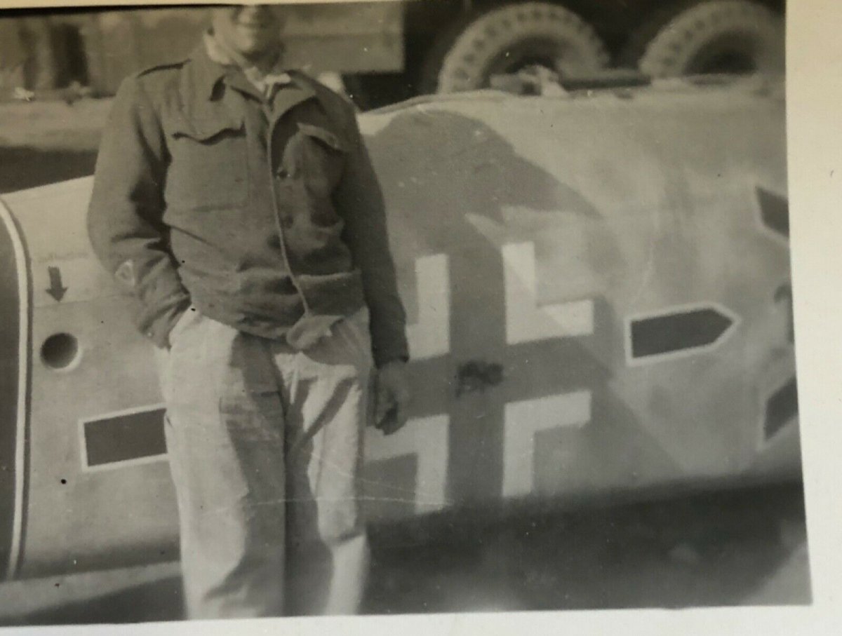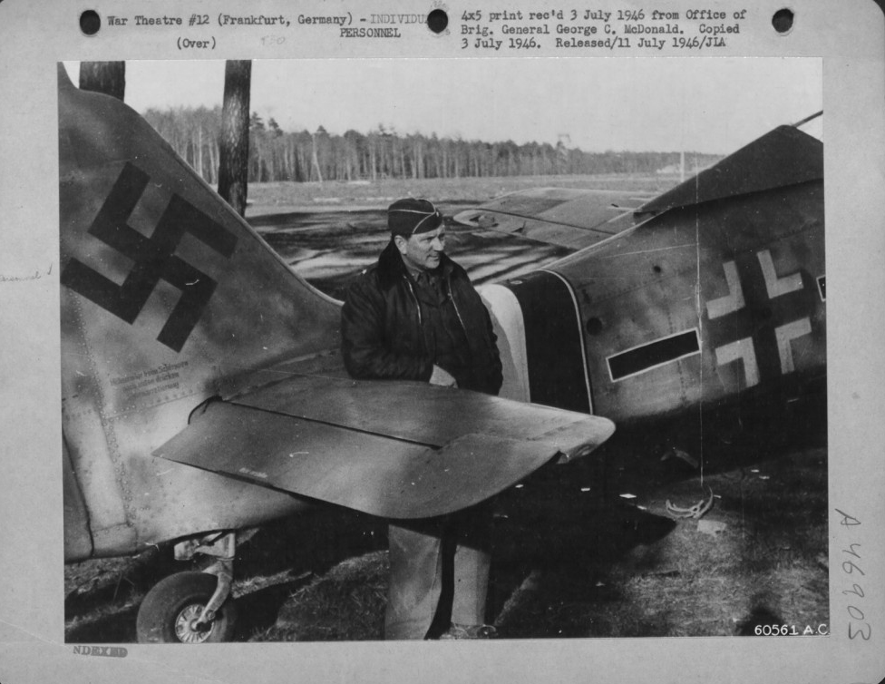 Впрочем выяснилось, отчего Франц был так задумчив: он хотел придумать своему новому самолёту совершенно новое, уникальное имя. И назвал его "Fratz III" На этой машине 27 сентября 1944 года он совершит вынужденную посадку на брюхо и её спишут. Не знаю, что случилось с Шааром, но "Fratz IV" в истории Люфтваффе уже не встречается. Видимо, у Франца закончились творческие идеи. Что у него в руке?
