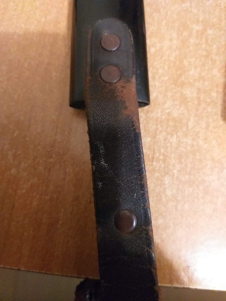 Ножик на руках---фото тільки такі---вибачайте Ніж був знайдений прошлого року при розбірці старого будинку в Німетчині--був замотаний в кусок матерії біля самого димара---по ходу від температури і пішов собі павучок Ножни без іржі-шкіра не рвана Лезо без втрат геометрії---но грішки видно Павучок при нажимі рухається під вагою пальця