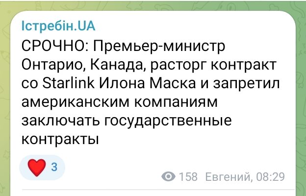Вони покривали частину витрат на старлінки для споживачів в віддалених регіонах. Відмовились і почали вести оптоволокно чи щось таке. Цю новину бачив раніше в відеоролику канадійця з українським корінням. Там реально взбісились на маска. Він ще й по матері канадієць виявляється. Є петиція 200тис + за позбавлення громадянства))). Теслу теж бойкотують ..))