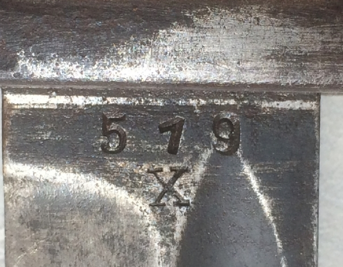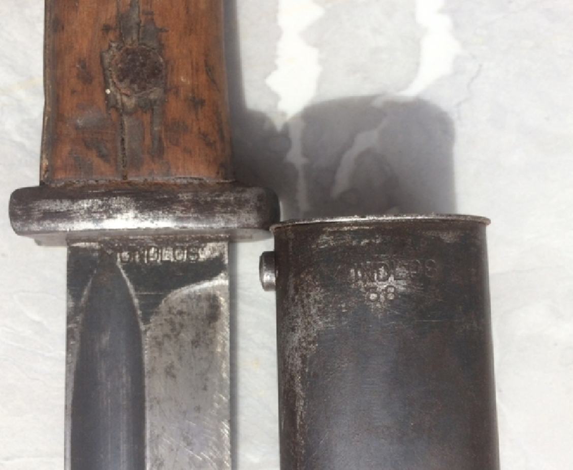 Следы ее присутствия имеются . Штык из военного заказа .Кнопка срезана и заполирована давно . Если это было сделано до 1945 года то скорее всего использовался как внестроевой ( для ношения с повседневной униформой вне боевых действий ) . У меня есть подобно модифицированный копанный ( правда у него были щечки на шпильках и отсутствовала огнезащита ) . Если после 45 го то как хирш для охотников и патриотических ферайнов . Обыкновенно у вторых отпиливали голову ( прямо ножевкой ) но могли и так поступить .