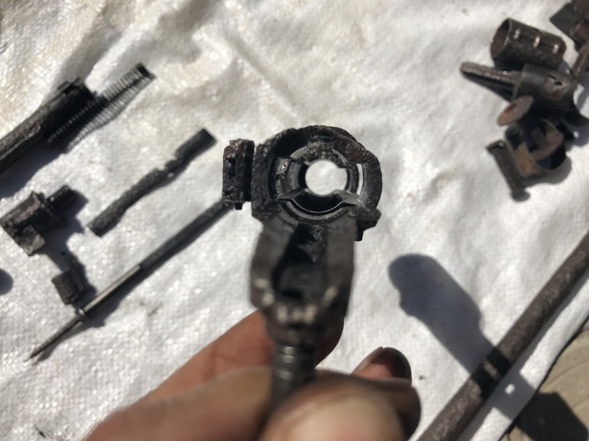 Добриц вечір! Цікаво реально об‘єктивні думки стосовно заліза. Наявні майже всі деталі в тому числі і на дерево, окрім тильника Все розбирається, клацає. Внутрянка рами нормальна, затвор ходить спокійно. В дереві сидить чудово, деактив нажаль такий... проріз біля патронника та продольний проріз посередині ствола внизу. В патронніку я так зрозумів була гільза, коли її намагались дістати вона лопнула пополам. Половина гільзи залишилась там. З недоліків: лопнута пружина на прицільній планці. Лопнута пружина на отражателю. Бойова пружина оригінал, але просівша Зуб екстрактора в доброму стані, але під відновлення В маг. коробці є дефект, та не зрозумілий мені отвір від сверла, але на функцію не впливає Відсутня пружина подавателя З пов