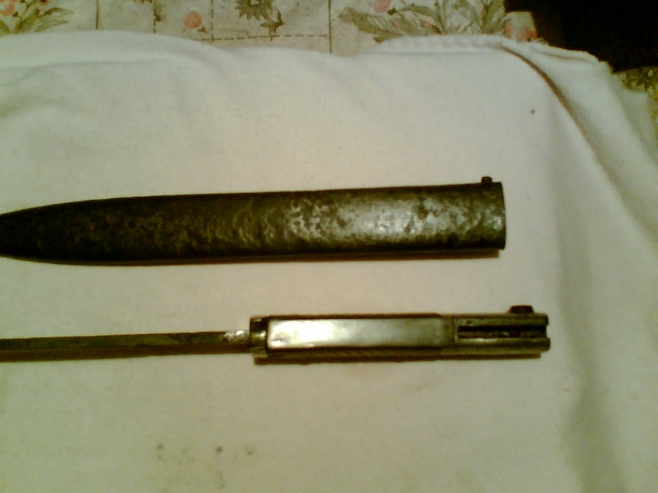 Постараюсь показать.Фотки есть только с телефона(показывать стыдно). Позже сделаю качественные. У меня не было гарды и огнеупорки(как то писал на форуме) .Воронение на лезвии родное.Я его не трогал.Наклепал гарду и "поворонил" ручку и ножны.Ну и жабу тут купил.Штык не парный.На этом и остановился.Не судите строго.Первая фотка до "воронения".