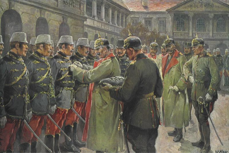 Австрийский художник Альфред Рудольф Хегер (Alfred Rudolf Höger1877-1930) писал картины в жанре "любовные истории" Но во время Первой мировой войны много картин написал на военную тематику,есть и Вильгельм II: Фото 01 Kaiser Wilhelm II dekoriert eigenhändig eine Anzahl Honvédhusaren mit dem Eisernen Kreuz (Dezember 1914). Кайзер Вильгельм II награждает союзников железными крестами.