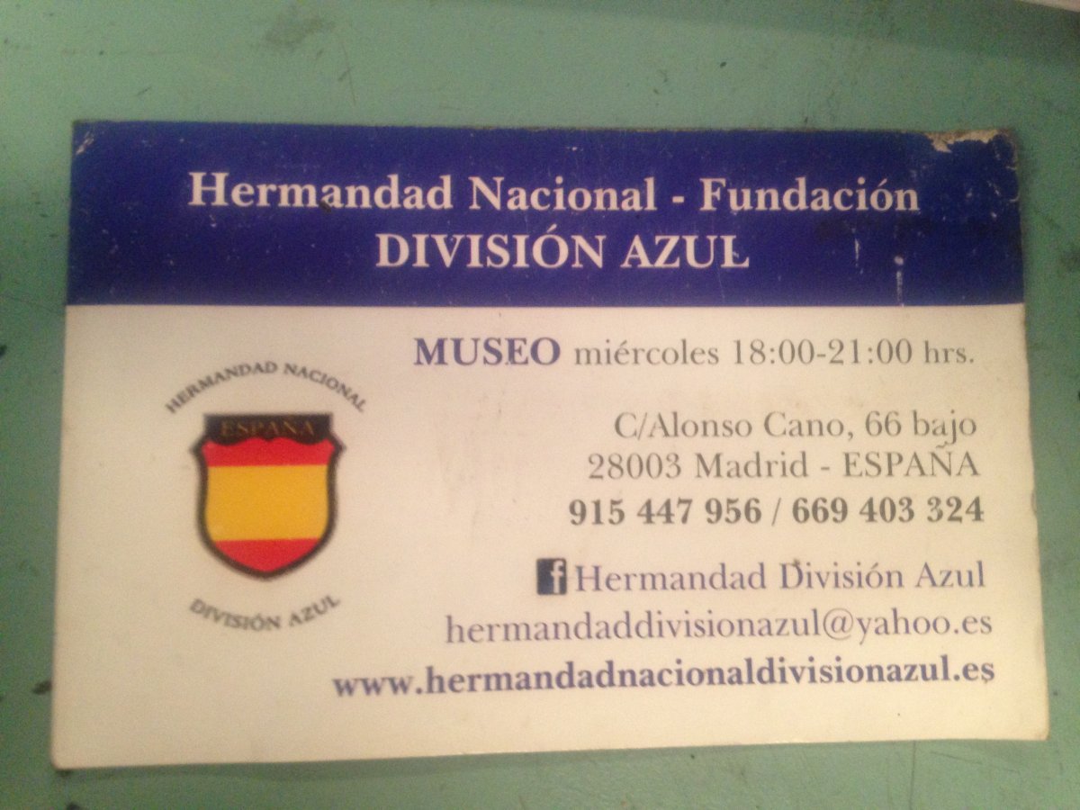 Саня , у меня визитка музея Голубой - Синей Дивизии Но они ска открыты по средам - дебилизм Но они как бы , закрытый клуб по интересам ... Ну и визитку мне дали не случайно Маленькая справочка : Azul , значит синий (!) , а голубой - это azul celeste .