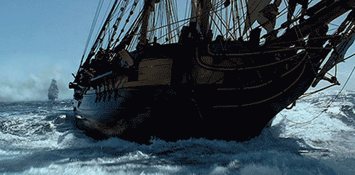 Смотришь на гифку. Море бушует, фрегат на гребне волны нависает над камерой своим бушпритом. А ведь кто-то это всё снимает. Так и представляется на какой-то лодочке оператор с камерой и помощник оператора на веслах перед кораблем.