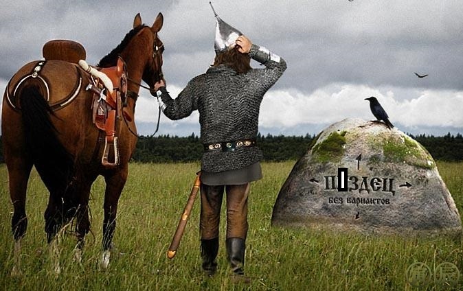 едет богатырь,на равнозначном перекрестке камень с надписью-прямо поедешь-п-ды получишь,налево-направо-назад-аналогично.Чешет репу-голос из за камня-думай быстрее,а то п-ды получишь.