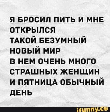 Ну если по рифме, то перефразировал бы так.. Я бросил пить.. И мне открылись страшненькие факты И про себя и И про любимый мир.. Что он безумен,много страшных жнщин. Что закусон мой - вовсе и не пир. Ещё открылось, коль не пить, не похмелятьсья, Хотя б с утра или когда стакан мне поднимать не лень- То и святая, долгожданная мной пятница- Уже обычный и рабочий день.