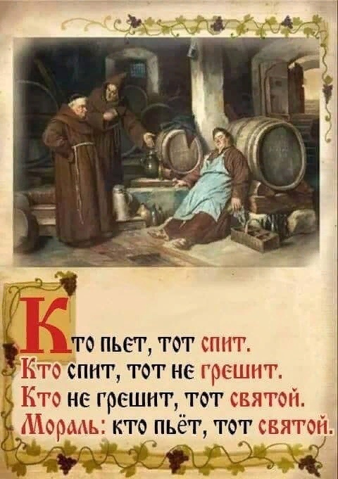 Из армейского фольклора : Кто много пьёт , тот много спит , Кто много спит , тот не вредит , Кто не вредит , тот чист душой, Так делай вывод - пей родной ! Привет Саня !