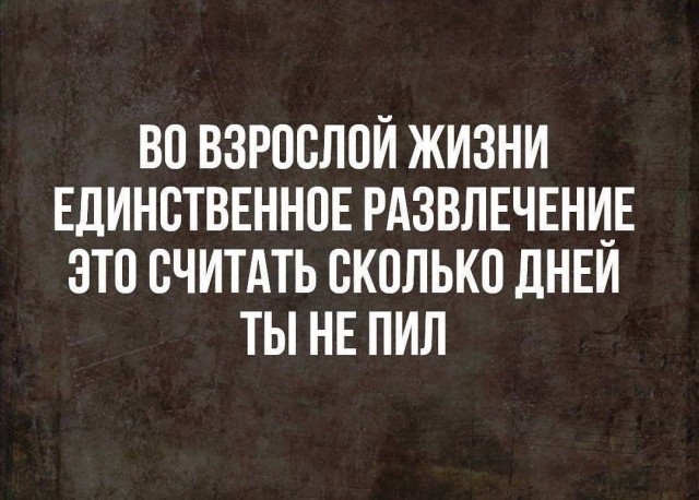 Взрослая жизнь это когда ты перестаёшь удивляться и начинаешь Взрослая жизнь - это когда ты перестаёшь удивляться и начинаешь охуевать.... Взрослая жизнь наступает тогда, когда ты перестаёшь расстраивать родителей и родители начинают расстраивать тебя.... Детство заканчивается в тот момент, когда ты перестаёшь бояться сдавать кровь на анализ и начинаешь бояться его результатов.... Взрослая жизнь - это когда хочется плакать, но некогда.... Взрослая жизнь - это когда круги под глазами больше, чем твой круг общения.... Взрослая жизнь - это когда единственный, кто запрещает тебе все клевые вещи, исключительно ты сам. ... Взрослая жизнь - это когда у тебя нет времени рыдать на полу, потому что ты его еще не помыла.... Взрослая жизнь - это когда никто больше не говорит, что ты очень умный для своего возраста.... Взрослая жизнь - это когда ты еще не уснул, а уже мечтаешь о том, как завтра придешь с работы и ляжешь спать в 8 вечера.... Взрослая жизнь - это когда отправляешь друзьям не смешные картинки, а смешные вакансии....