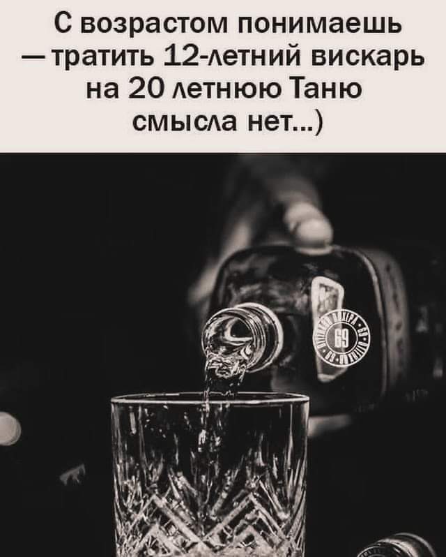 З віком розумієш, що нех.. взагалі витрачати гроші на 12річний віскарік. Бачив багато пафосних початків застілля з дорогим алкоголем, якого виявлялося потім мало і пили вже що було, навіть горілку з "п'ятішки " , або усе шліфувалось пивом, і як результат ранок "не добрий"...