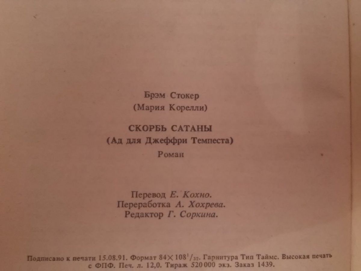 Доброе утро гарнизон. Тут спорь или не спорь но Дракулу написал дядка Абрахам "Брем" Стокер (Стоукер).....а с книгами переведенными на русский язык в конце 90-ых илли которые переводят сейчас особенно мемуары немецких солдат надо держать ухо в остро (много туфты). А так The Sorrows of Satan ''Скорбь Сатаны'' написала всё таки женшина Мария Корелли (Маккей; Mackey)....