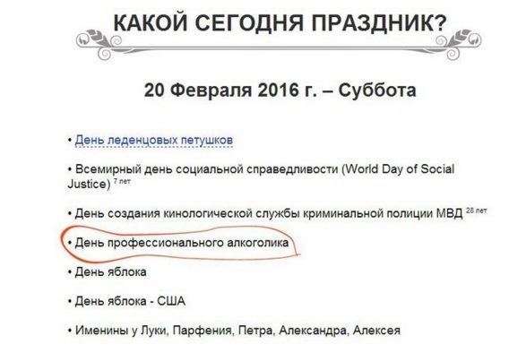 Петушков простим , или в крайнем случае пропустим. Про соцсправедливость много раз слышал, но ни разу не видел. Так шо мимо. День кинолога ? В кино перестал ходить с тех пор, как там стали жрать маис и пить Пиво . День профалкоголика? - Провёл в трезвости, ибо не было тоста . Яблоки точил весь день. С Александром никто не поздравил. Чудно время провели.
