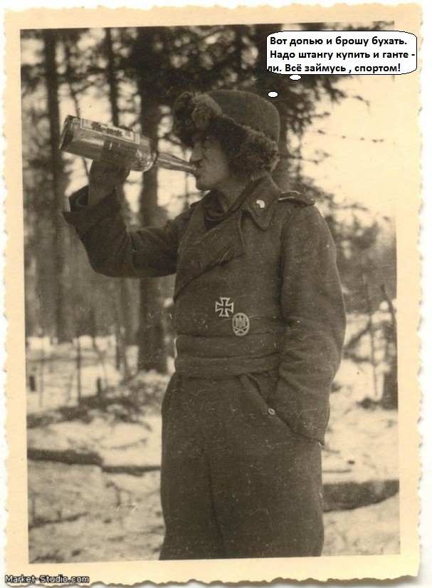 Фриц бросил пить, но спортом заняться не смог, меткая пуля гв. рядового Н.В. уложила фрица насмерть, спать....а все подумали что это был самогон.....