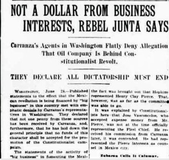 Заголовок "Ни одного доллара от от деловых кругов, заявляют повстанцы", далее "Агенты Карранцы в Вашингтоне категорически отрицают поддержку нефтяной компанией конституционного переворота (в Мексике)"