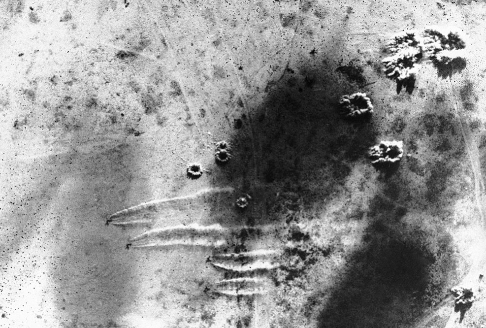 Этот снимок сцены воздушного налета на авиабазу стран «оси» «Martuba», которая находится недалеко от города Дерна в Ливии, был сделан с борта южноафриканского самолета, принимавшего участие в рейде, 6 июля 1942 года. Четыре пары белых полос внизу – это пыль, поднимаемая самолетами гитлеровской коалиции, которые пытаются избежать бомбардировки. (AP Photo)