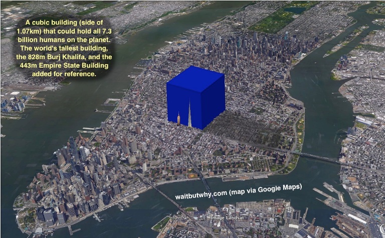 Не так уж и много людей)) Если всех жителей Земли собрать в одном месте Вот такой куб со стороной 1,07 км, расположенные на острове Манхэттен в Нью-Йорке, может вместить 7,3 млрд людей, проживающих на нашей планете. Для сравнения рядом с кубом помещены небоскрёбы-рекордсмены: Бурж Халифа (828 м) и Эмпайр-стейт-билдинг (443 м).