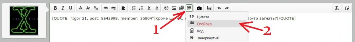 Загрузить картинку. Нажать спойлер, назвать его. Поставить курсор по центру между скобками. Нажать кнопку миниатюра или полное изображение. Вуаля.