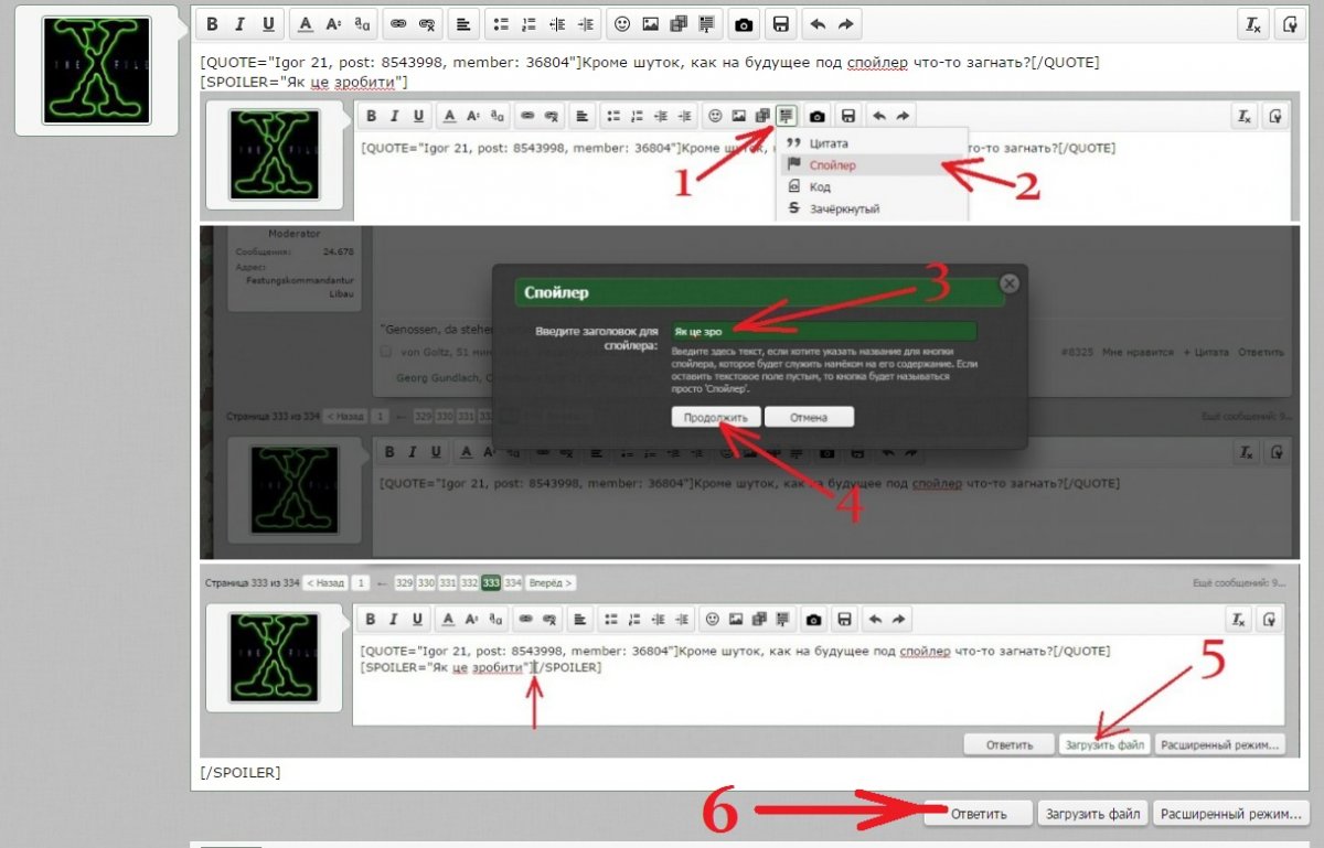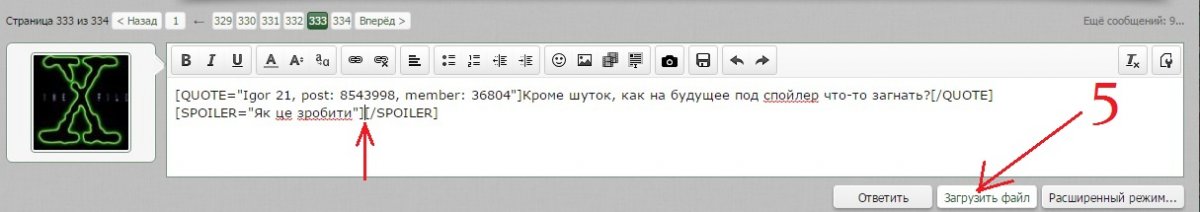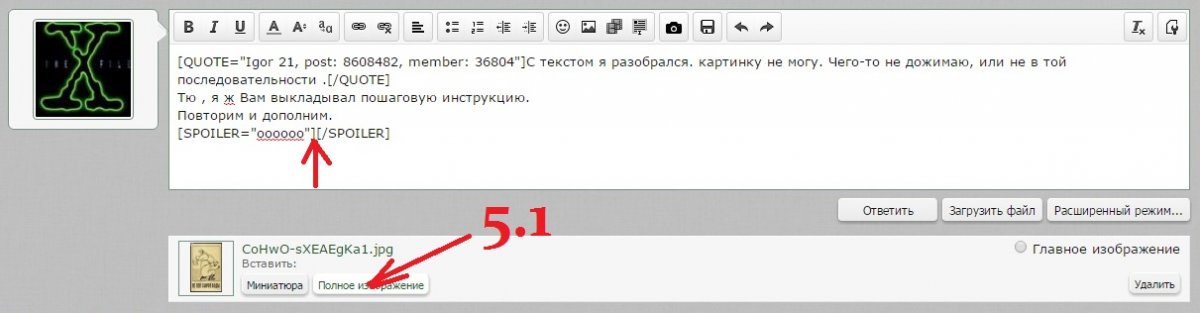 Тю , я ж Вам выкладывал пошаговую инструкцию. Повторим и дополним. Если хотите , чтобы картинка под спойлером была в полный размер , выполните п.5.1 (нажмите "Полное изображение") , после чего кнопка "Ответить".