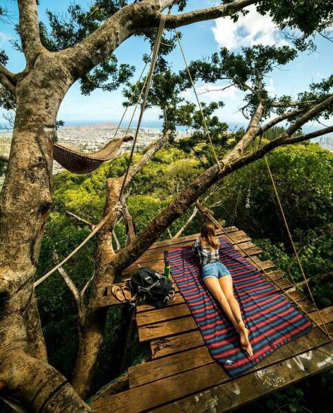 Из гамака на помост не совсем удобно добираться.