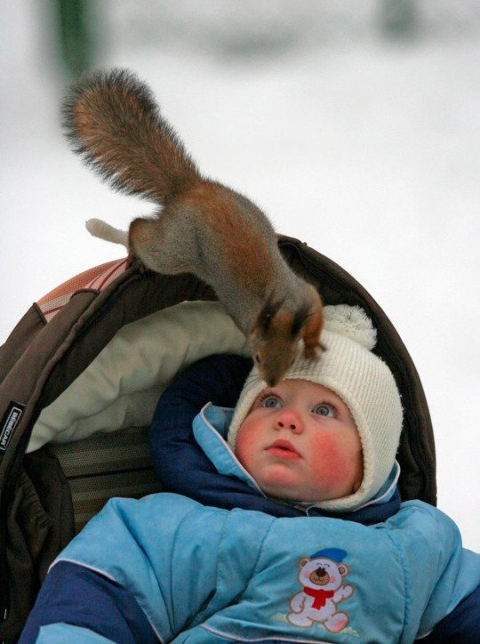 То белочка воришка, чует от ребенка вкусняшки, в коляске всегда печенюшки какие, щас скрадет, они шустрые на это дело)))))