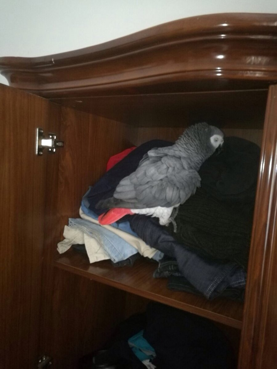 Не опасаетесь , что он там нагадит ? А вообще это он дупло ищет , им нравиться в замкнутые пространства ховаться... Поставте соответствующую размерам картонную коробку на шкаф... Ваш питомец будет щастлив .