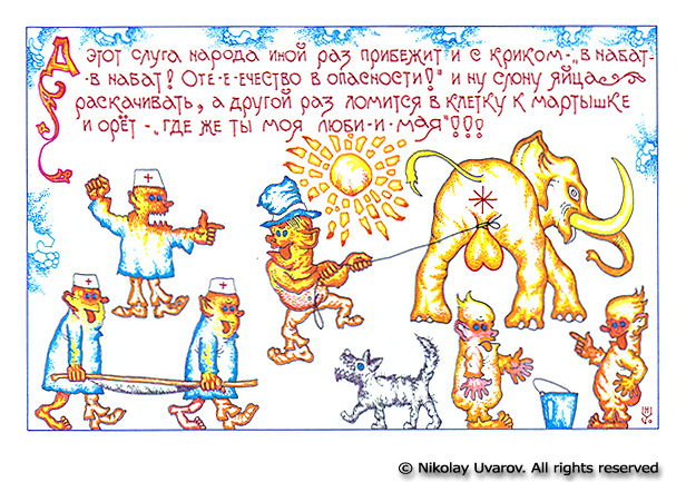 Или одна - муха. Или легион - мухи. Приходят два мужика в ресторан, садятся за столик... За соседним столом сидит молодого вида интересная девица, чуть расставив ноги. Один мужик другому: - Смотри, чего-то у нее там чернеется? Трусы наверно. - Да нет, ты что! Это же волосы! - Да нет, я тебе говорю - трусы! Позвали официанта. - Милейший, вон видишь ту девушку? - ? - Подойди к ней, как бы невзначай урони салфетку, нагнись и рассмотри, что там такое чернеется. Официант идет, роняет, наклоняется, заглядывает и... падает в обморок. Эти двое вытаскивают его в коридор, отливают водой. - Hу, чего там? Трусы? - Волосы? Официант упавшим голосом: - Мухи!