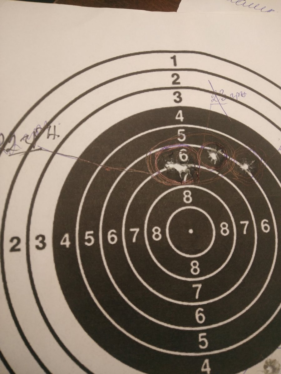 Точность сильно зависит от изготовления боеприпаса. От навески пороха и массы пули. На мишени видно три попадания в районе 6 и 7 вверху. Навеска 22 грн. Расстояние 90 м. Стрельба с жесткого упора. Навеска не стандартная. Порох немецкий.
