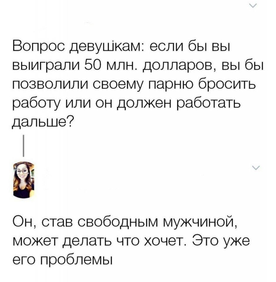 Муж и жена, лет так за 60, празднуют свою 35-годовщину свадьбы в маленьком ресторанчике. Цветы, музыка, романтика... И тут появляется фея и говорит: "За то, что вы такие молодцы, уже 35 лет вместе, никогда друг другу не изменяли, жили мирно и счастливо, я подарю каждому из вас по желанию. Загадывайте, что хотите". Ну, жена, радостно озвучивает свое желание: "Хочу в кругосветное путешествие со своим любимым мужем"- бах! - и 2 билета на роскошнейший лайнер у нее в руках. Очередь мужа загадывать. Он подумал и говорит: "Это все конечно хорошо, романтика и вся фигня, но такой шанс выпадает только раз в жизни, поэтому извини, дорогая, но я хочу себе жену на 30 лет моложе". Жена в шоке, фея в шоке - но желание есть желание... Бах! - и муж Стал 92-летним стариком. Мораль: Неблагодарные мужчины, помните, феи - тоже женщины!