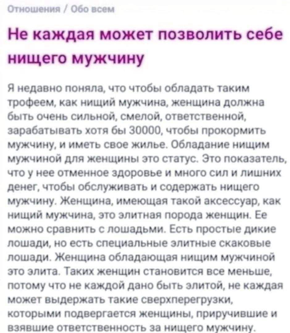 Я не можу стримати сміх, коли чую історії кинутих чоловіків. У нас все було добре, а потім – раптово і бах – вона пішла. Ні, не до іншого чоловіка, а просто так – у далечінь. Таких чоловіків залишається тільки обійняти і плакати. Ну як можна бути такими наївними?! Втім, це може бути і захисною реакцією психіки, коли ой як не хочеться помічати проклюнулися на голові рогів. Жінка ніколи не йде «раптом». Цьому завжди передує певна поведінка. Це три складових поганої дружини, про які я вам і розповім. Перша ознака практично нешкідлива. Сама по собі, окремо від двох наступних, вона не говорить ні про що, але в комплексі з ними – обов’язковий специфічний симптом. Це любов до подорожей. Ні, зовсім не важливо куди, а важливий процес. Їй не сидиться на місці, її постійно кудись тягне. “Ми нікуди не їздимо, я хочу в гори, мені потрібно на море, а на вихідні йду в похід”. Жабі-мандрівниці постійно кудись треба. Сидячи на місці, вона вважає, що її життя проходить даремно. Спочатку їй неважливо, куди і з ким їхати. Чоловік їй не заважає, тому що поки вона не планує зраджувати. Їй просто нестерпно вдома, поки подруги пізнають світ. Подруги – це другий специфічна ознака поганої дружини. Ні, не всі подруги, а ті, хто вже наставляє чоловікам роги. Посиденьки з ними в кафе, походи в клуб, і все це відбувається без чоловіка. Правильно, що йому робити з ними? Адже принадність зустрічей для поганої дружини в захоплюючих оповіданнях і обговореннях. Подруги щедро діляться постільними новинами: з ким, де, якої довжини. Прикрашаючи й ідеалізуючи, щоб прикрити розпусту романтичним флером. Погана дружина, слухаючи ці історії розвісивши вуха, пускає слину від заздрості. Хіба можна порівняти її сумне статеве життя в орендованій хрущобі з пригодою в Еміратах з казковим принцом? Літати на відпочинок з чоловіком стає нестерпно. Та й він не може. Погана дружина підсвідомо вибирає такий час, щоб чоловік не зміг подорожувати з нею. Можливо, вона поїде на море з дітьми і візьме свою маму, щоб було на кого їх залишити. А сама, вся така в пошуках романтичних пригод, рушить по морському проспекту, розмахуючи парео на товстих стегнах. І ось тут відбувається зрада. Але не з казковим принцом, а з якимось аборигеном Вазгеном. Людина високої якості не спить з мавпами, але жінка цього не розуміє. Щоб скрасити своє падіння на мавпячу лежанку, погана дружина починає частіше вживати алкоголь. Це третя кваліфікуюча ознака. Під алкоголь легше мріяти про себе про принців – раз. Брехати подругам про те, який у неї офігенний коханець – два. Не так огидно згадувати стосунки з аборигенами – три. Крім того, під синьку легше давати. І в подорожах, і, що особливо важливо, в умовах мегаполісу, тому що зрадивши на відпочинку, вдома зупинитися не можна. Загалом, якщо ваша баба любить подорожі, посиденьки з подругами і не проти гарненько випити, можна сміливо вважати, що вона – погана дружина. Роги гарантовані, як мінімум, а взагалі вона рано чи пізно звалить з сім’ї, забувши все, що вас пов’язувало. Так, це гірка правда, яка назавжди здатна знищити самооцінку кинутого поганою дружиною чоловіка. Але сильній статті все ж не варто засмучуватися, життя справедливе. Курка ніколи не знайде принца, а швидко спившись, стане посміховиськом. Якість її життя погіршиться і з кожним днем буде лише падати. Аборигени – дикі люди, п