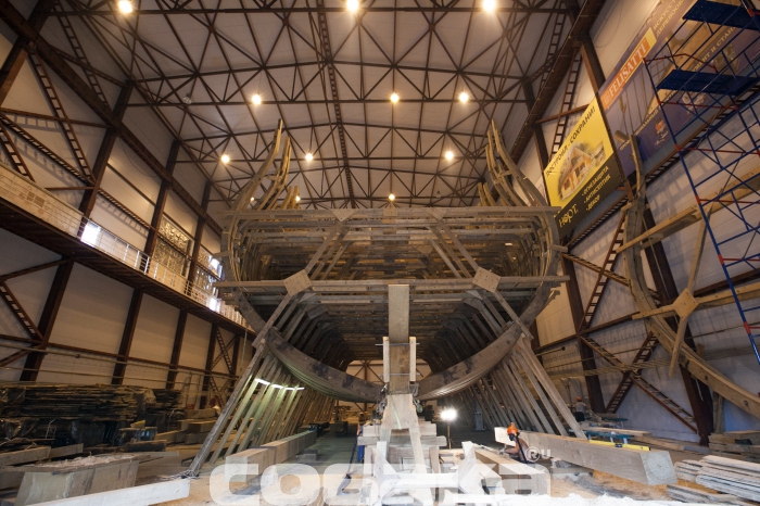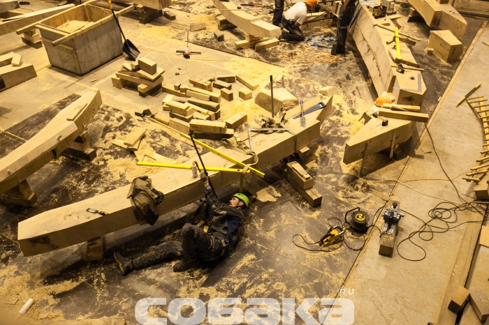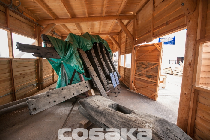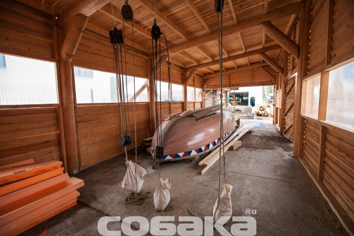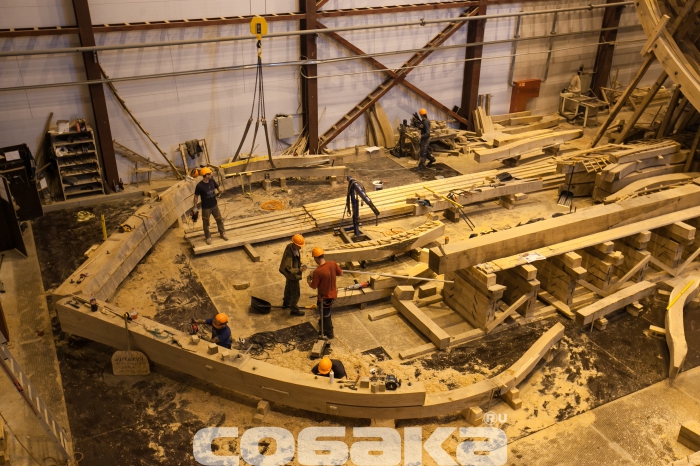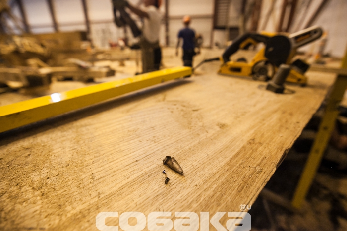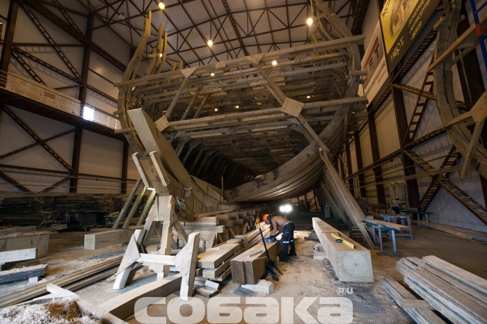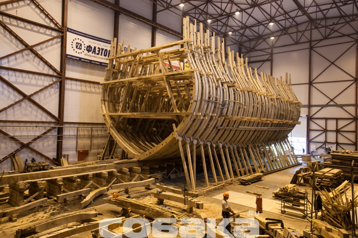 Технологический процесс: Верфь исторического судостроения Мы побывали на верфи исторического судостроения, где сейчас идет масштабное строительство — воссоздание линкора «Полтава», символа петровской эпохи. Оказалось, по прошествии 300 лет корабельные мастера сталкиваются с теми же проблемами, что Петр I в свое время. Вопрос о том, почему было принято решение о воссоздании именно петровской «Полтавы» напрашивается сам собой. Все дело в том, что корабль стал первым крупным военным судном, построенным в Петербурге, входил в состав Балтийского флота, принимал непосредственное участие в нескольких военных компаниях, но, к слову сказать, не был задействован в крупных военных баталиях. «Полтава» в буквальном смысле стала детищем Петра I: царь сам принимал участие в строительстве и проектировании корабля. К идее воссоздания судна пришли около двух лет назад, еще в 2012 году. По инициативе председателя Совета директоров ОАО «Газпром» Алексея Миллера уже год спустя было принято решение о строительстве точной копии первого линейного корабля. Специалистам потребовалось много времени, чтобы отыскать необходимые архивные документы, с помощью которых можно было бы создать чертеж современной «Полтавы». Нужных документов, к сожалению, осталось мало: гравюра, опись и часть чертежей корабельного мастера Федосея Скляева. Грандиозное строительство осуществляется при содействии яхт-клуба Петербурга на территории яхтенного порта «Геркулес», в поселке Лахта. Основное строительство корабля началось в феврале этого года, хотя задолго до этого уже велись подготовительные работы. Сроки постройки современного корабля совпадают с теми, что были при Петре. В течение трех лет мастера создавали 54-пушечный линейный корабль 4-го ранга: столько же времени понадобится и нынешним специалистам. Воссоздают корабль на современной верфи, на территории которой разместили мастерские, сборочный ангар и стилизованный домик корабельного мастера. На данном этапе в ангаре находится конструктивный «скелет» корабля, выполненный уже наполовину. Позже будут смонтированы палубы, начнется обшивка и уже, много позже, примутся за разработку внутреннего убранства судна. Еще на первом этапе строительства «Полтавы» специалисты столкнулись с теми же проблемами, которые возникали в свое время у Петра: нехватка грамотных специалистов и качественного материала. Найти мастеров, которые разбираются в технологиях постройки корабля крайне сложно, но с этой задачей справились довольно быстро: в строительстве принимают участие специалисты, приложившие руку к созданию фрегата «Штандарт». Что касается материалов, то для постройки деревянного корпуса используют крупноразмерный дуб, которому не меньше 150-200 лет. К сожалению, в Ленинградской области такого материала найти не было возможности, поэтому лес везут из Саратовской, Брянской области, Краснодарского края. Помимо дубового массива, будут использованы хвойные деревья,на завершающих этапах строительства — лиственница. В процессе обработки древесины, буквально несколько дней назад, мастера нашли внутри одного из дубов пулю начала ХХ века и такие находки, как правило, не редкость. Параллельно со строительством деревянного корпуса, на площадке будут создавать мачты и реи, эзельгофты, уже построена отдельная мастерская, 