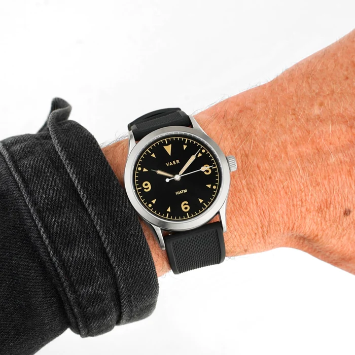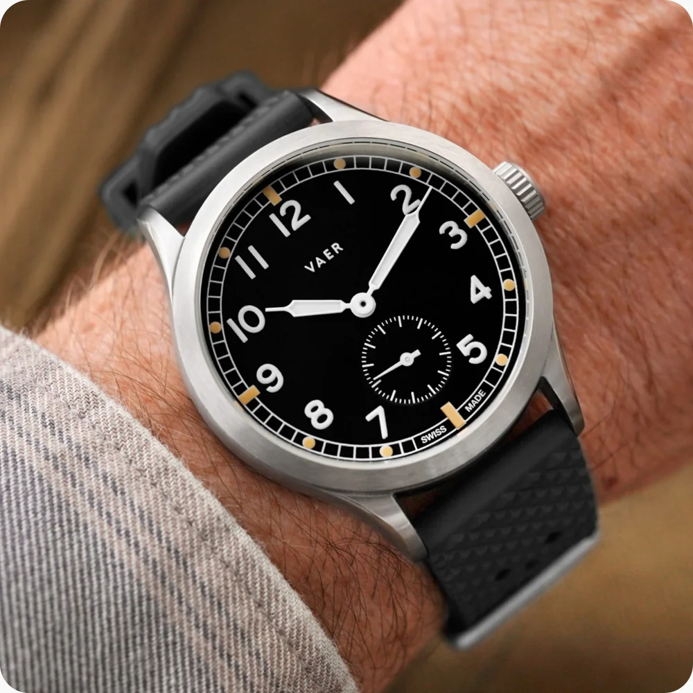 Опис від виробника Vaer Спойлер Спеціальне видання вшанування ікони військового часу. Поєднання престижу європейської розкоші з повсякденною корисністю в основі нашого бренду. Наше рішення продовжити виробництво A12 у Швейцарії було мотивовано нашою метою створити шанобливе ставлення до швейцарських військових годинників «Dirty Dozen» часів Другої світової війни. Функціональний, привабливий та історично актуальний, Vaer Dirty Dozen представляє не лише постійні інвестиції у вічний, міцний дизайн, але й нашу глибоку повагу до історії годинникової галузі. Подібно до 12 військових предків, які носили маркування WWW для водонепроникних наручних годинників, A12 Dirty Dozen ідеально підходить для підводної діяльності. На задній частині корпусу та заводній головці використовується різьбовий дизайн, який забезпечує герметичність, що робить годинник функціонально водонепроникним. Важливо те, що на відміну від більшості океанських годинників, наші швейцарські автоматичні також неймовірно тонкі та зручні на зап’ясті, маючи діаметр 36 мм. Для подальшого підвищення цінності та функціональності годинника «від океану до офісу» кожен A12 стандартно постачається з двома змінними ремінцями. Наші варіанти ремінців Vaer включають ряд опцій, готових до використання в океані, призначених для водних видів діяльності, а також наших преміальних шкіряних ремінців Horween, які дубляться в Чикаго та виготовляються вручну в США з важкої місцевої шкіри бика. Окрім шкіряних ремінців Made in USA, кожен Vaer A12 збирається вручну та тестується у Швейцарії. Ми прагнемо швейцарського виробництва моделі A12 не лише тому, що це покращує якість продукту, але й тому, що це додає сильного відчуття місця та індивідуальності нашому бренду. Зроблено в Швейцарії. Міцний корпус із нержавіючої сталі 316L. Готовий до океану. 100 м або 328 футів. Автоматичний механізм Sellita SW260-1, зроблений у Швейцарії. Закручувальна заводна головка, що закручується . Діаметр корпусу - 40 мм