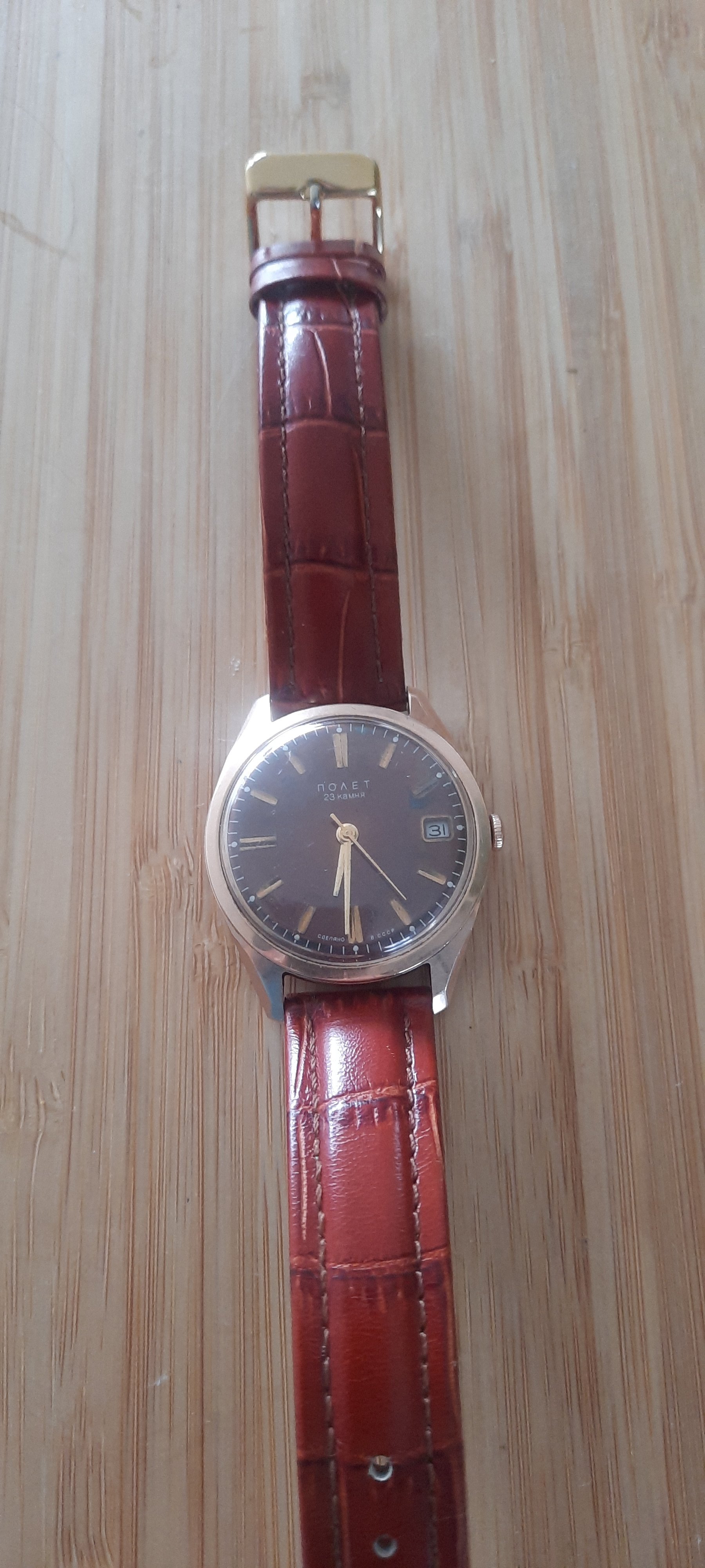 Годиннику вже близько 50 років, в мене майже років 30. Колись на мое народження їх купив мій дід. Вони пролежали у шафі поки я не прийшов з арміі, батьки віддали, діда на той час вже не було. Золотий годинник, з автоподзаводом-Полет 23 камня. Були в ремонті 2 раза, перший коли віддали, вони не йшли, другий раз, три роки тому впустив, впали на асфальт, розкрилися та зупинились. Зробили не дуже, туго заводяться, та поспішають десь на хвилину за три доби. Календарем не користуюсь, заводжу так сяк, коли зупиняться. Не слідкую, обідрав, десь потер, взагалі якось так.