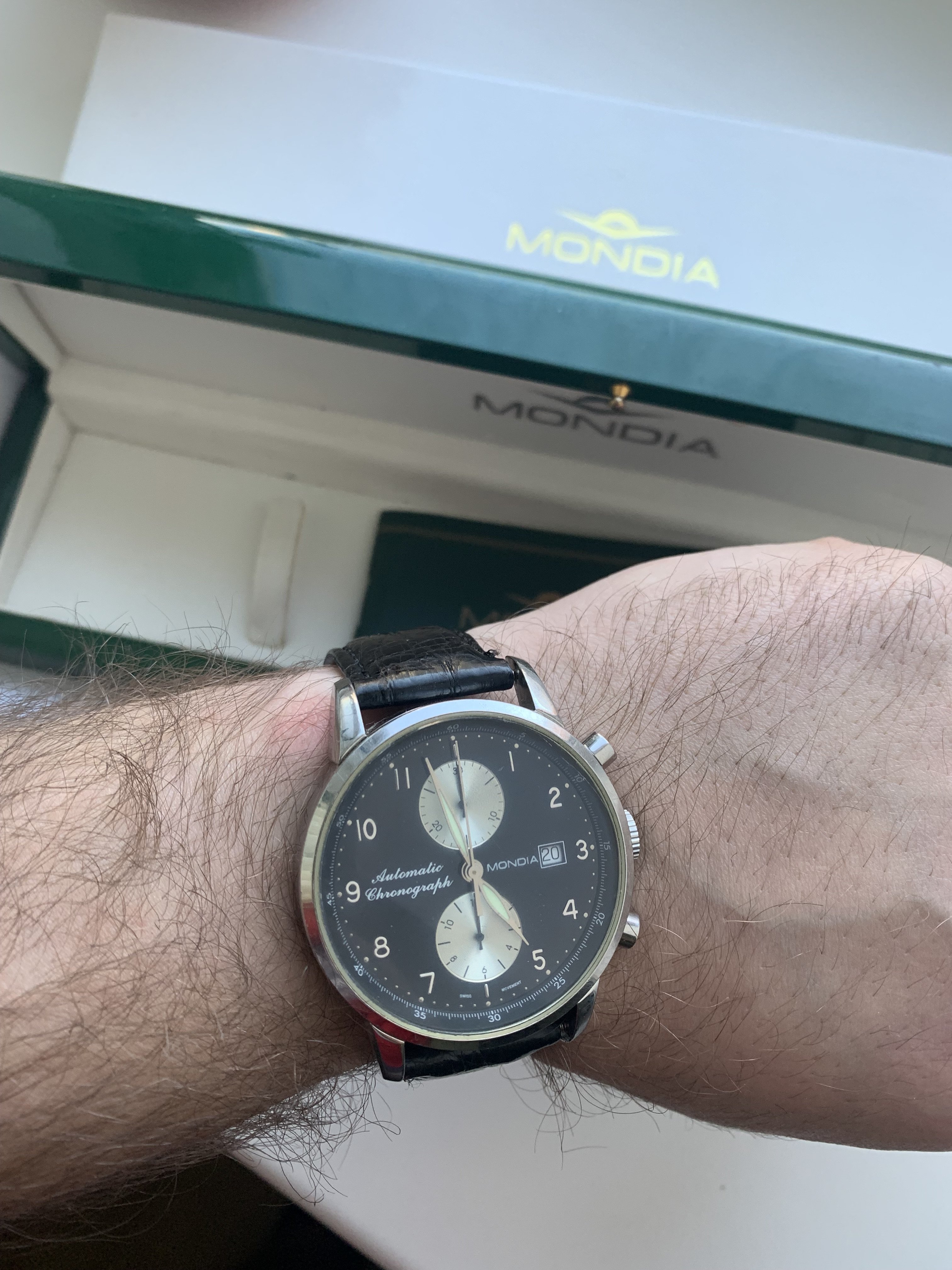 Всіх вітаю. Давно не показував ніяких годинників Останні декілька місяців заклопотаний і взагалі не до годинників. Проте нещодавно вирішив себе побалувати і купив ось такий годинник. Бренд хоч і не супер відомий, але це механічний хронограф. Механізм ETA Valjoux 7750. Годинник бу, але з усіма коробками і документами. Діаметр близько 42 мм.