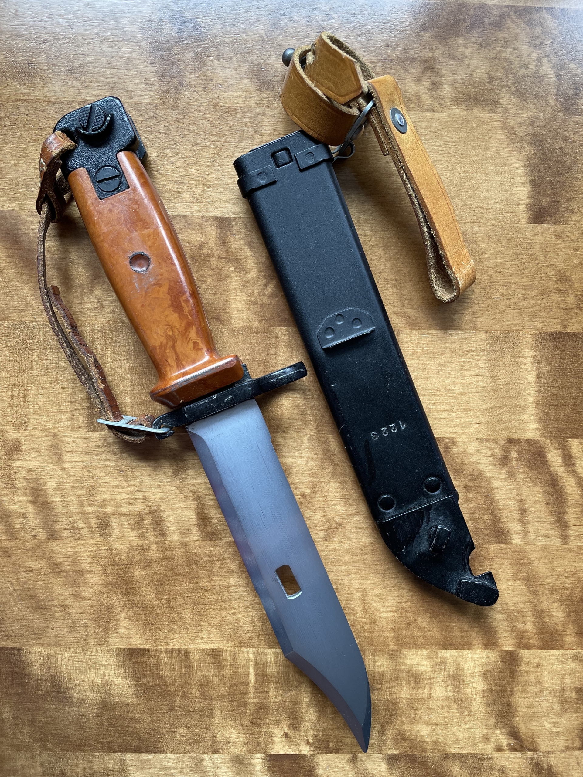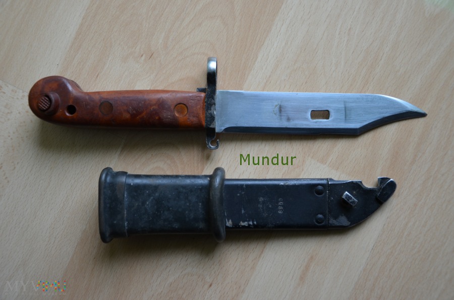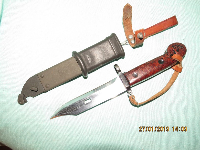 Это может быть штык для Египта . Заказ изготовляли в ГДР , из самого заметного у этих штыков отличается цвет клея и рукояти или кнопки . Что наводит на мысль о срочной сборке из запчастей разных производителей .