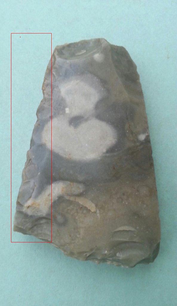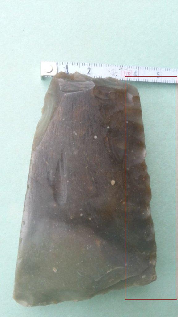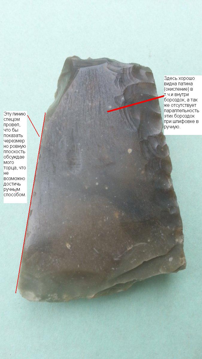 Доброго. 1. Это не топор. Рабочая кромка (режущая) расположена так, что закрепить данный предмет как топор не возможно! Можно только использовать как ручное рубило (режущую кромку выделил красным ): 2.Фото 6 - данный торец похоже зашлифован электроинструментом?! Почему так думаю :этот участок не имеет патины аналогичной шлифованным боковинам на других фото; так же на шлифованном участке бороздки от абразива параллельны друг другу, что происходит только при машинной обработке, а не ручной. 3. С учетом вмешательства в предмет - я пасс по определению его первоначальной функции и формы.