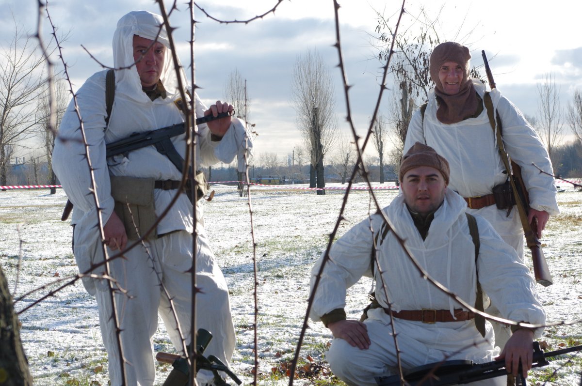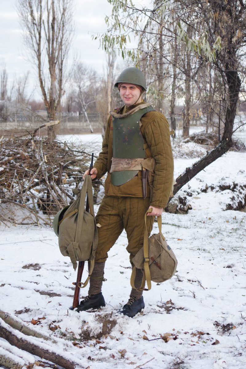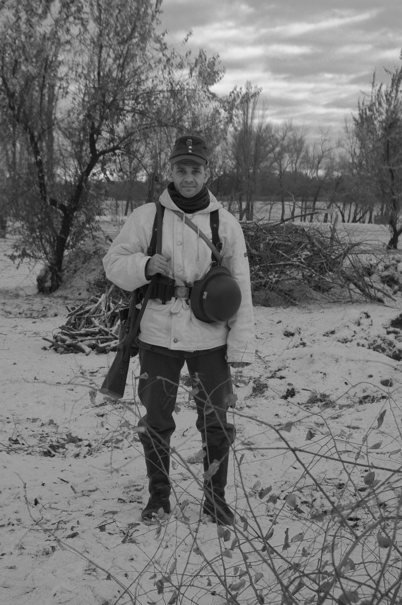 При изучении военной хроники,фото архивов,разговоров с ветеранами можно сделать соответствующие выводы,военная форма в зимнее время была смешаной,да,не удивляйтесь,вы тоже это знаете так чего?)Зимние маскхалаты выдавались спецподразделениям и спец ротам,определенные роты,максимум один бат. мог оснаститься зимними маскхалатами,все это делалось для спец.действий ну и разведки тоже.Ватные комплекты и штаны выдавались для бронетанков,артиллерии,и некоторых других видов войск ах да,водителей забыл.Что бы было понятно,войска,допустим батальоны или роты,тягали с собой максимум шинели,остальное они с собой не тягали.И если к примеру, при походе войск осенью резко пошел снег,то у них нет комплектов зимней одежды,все они получают со временем,так оно и есть,и тогда на всех не хватало,кому в первую очередь выдавали описывал выше.Так и с техникой,красим и не красим в белый).А что касается аутентичности то можно вот что,подсумок репарация у тебя,сними его,пусть лучше в кармане ХП шки будут,нет фляги РККА,ну не одевай послевоенную,пусть будет минимум но нормальный,но если дело касается 41-го,извините,там все четко надо,тут и я бессилен)Главное что бы мы развивались,советовали и помогали нашим камрадам не смотря что у него вермахт)Давайте так и дальше встречаться и проводить отличные рекконы и тактитки,просто встретиться и порадоваться за наших братьев по оружию.Я думаю больше нечего добавлять.
