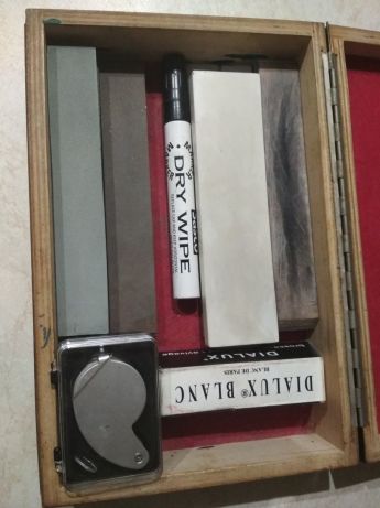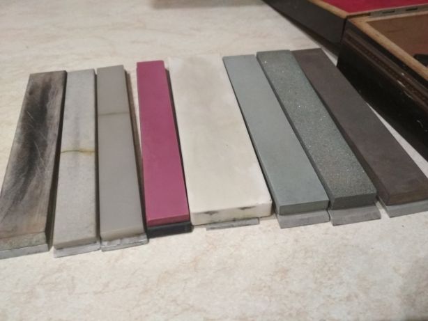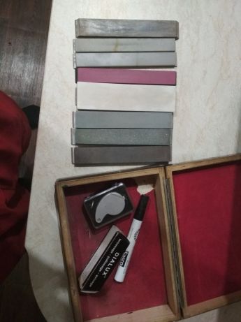 В связи с продажей точилки, остался набор камней для Апекса. Камни покупал у Ярослава. Базовый набор для Apex на основе карбида кремния. В набор входит 3 камня размерами 150ммх25ммх8-12мм 1. Обдирочный камень. (100 мкм. связка керамическая. средне-мягкая) (150 JIS) 2. Полуобдирочный камень (40-50 мкм. связка керамическая. средне-мягкая) (320 JIS) 3. Финишный базовой заточки (50 мкм. связка вулканитовая) (даст поверхность сравнимую с 600-800 JIS) ВыроботкаВкамней минимальнаям. Точильные камни из алюмокерамики типа Spyderco. Средняя и тонкая заточка. 1. Белая керамика размерами 150х40х10 (Выдает около 1500 JIS). Камень односторонний. Годится для работы как вручную, так и в станках типа Apex. Предпочтительна работа с маслом. 2. Красная керамика размерами 150х20х5. (Выдает около 3000 JIS). Камень ислючительно для станков типа Apex. Предпочтительна работа с маслом. Поставляется на бланке. Кожа на бланке для правки. Размеры 150х25х4,5-5. Кожа специально подготовлена для правки с полировальными пастами или без таковых. Очень качественная кожа растительного дубления. Плюс Арканзасы хард и транслюцент. На камнях есть трещины, заклеины, на работу не влияют. Порошок притирочный карбида кремния, неизпользованый. Бонусом отдам шкатулку для хранения, лупу с подсветкой. Цена за набор 900 грн. Возможна продажа по отдельности. Отправка новой почтой. Деньги на карту привата.