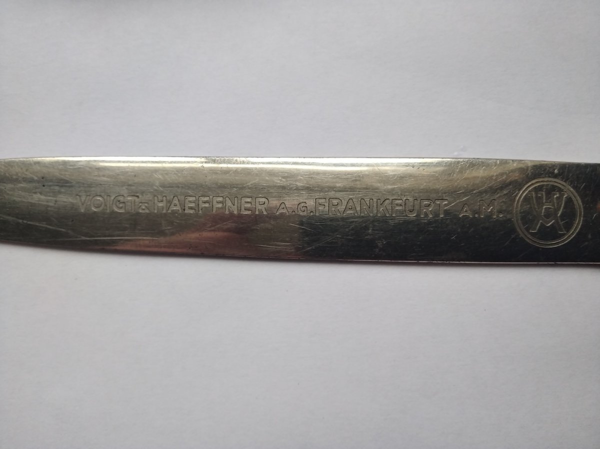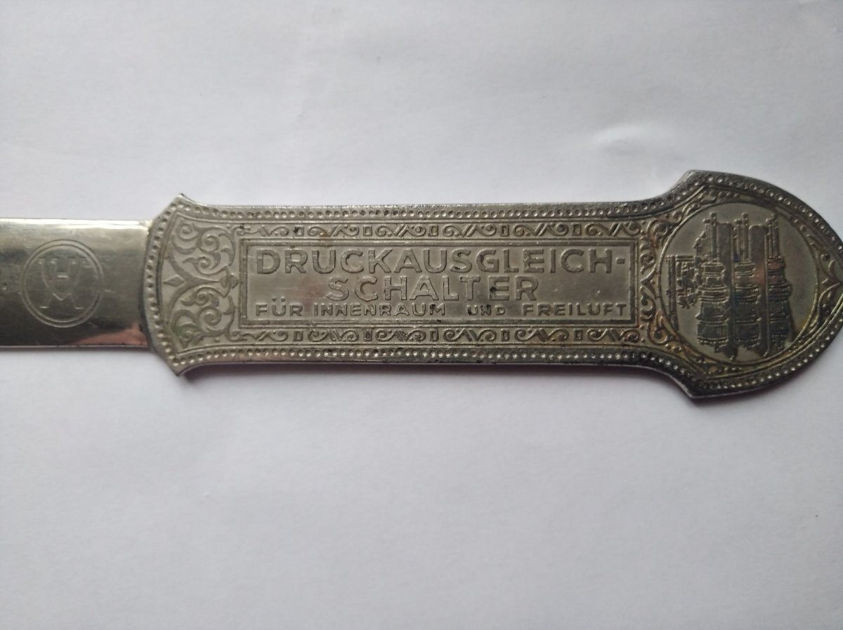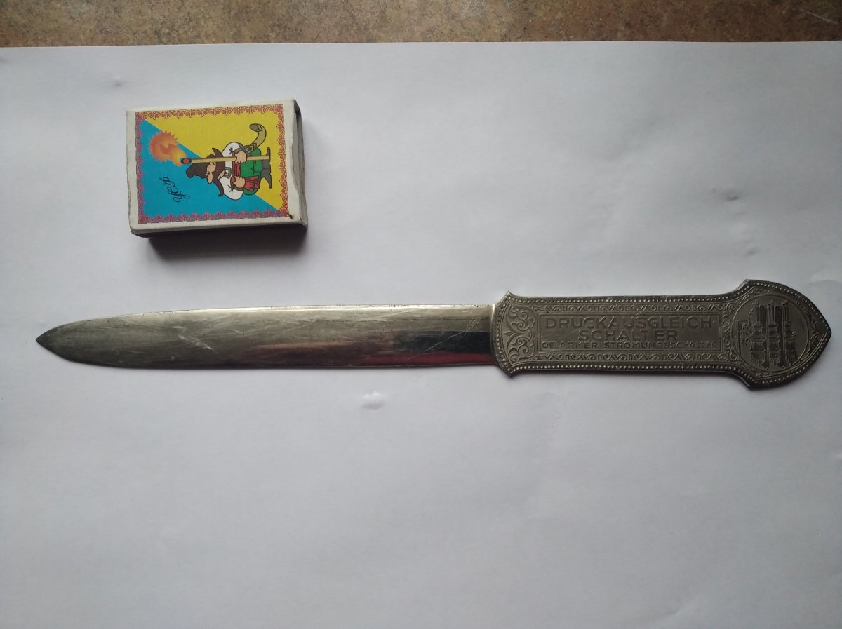 Briefoffner , немецкий нож для вскрытия конвертов ( элемент настольного набора письменных принадлежностей ) в стиле "толедо" с рекламной надписью . Первая треть двадцатого века . Фабрика существует до сих пор . Основатель известен и популярен в определенных кругах :)