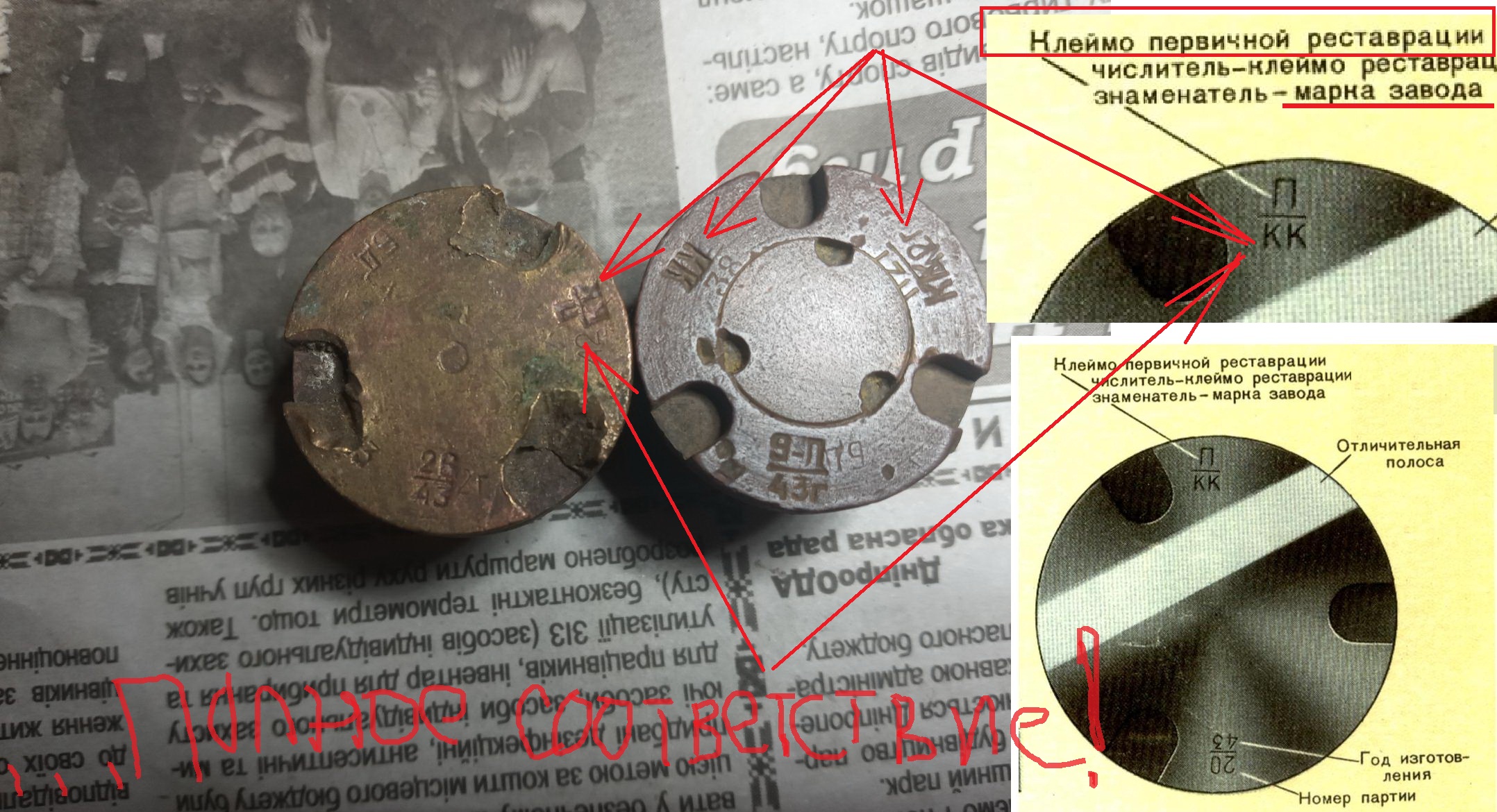 капсульная втулка на фото справа на 6 часов 43 г, на 10 часов 38, на 14 часов 42 г четко видно только букву г но при правильном угле видно 42 просто клеймо набито на другое клеймо. та что с лева видно всё на 6 ч . 28\43 и возле г стоит 2 если хорошо посмотреть перед двойкой видно 4 клеймо стоит по клейму, на 14 ч. 42. эти цифры обозначают года?