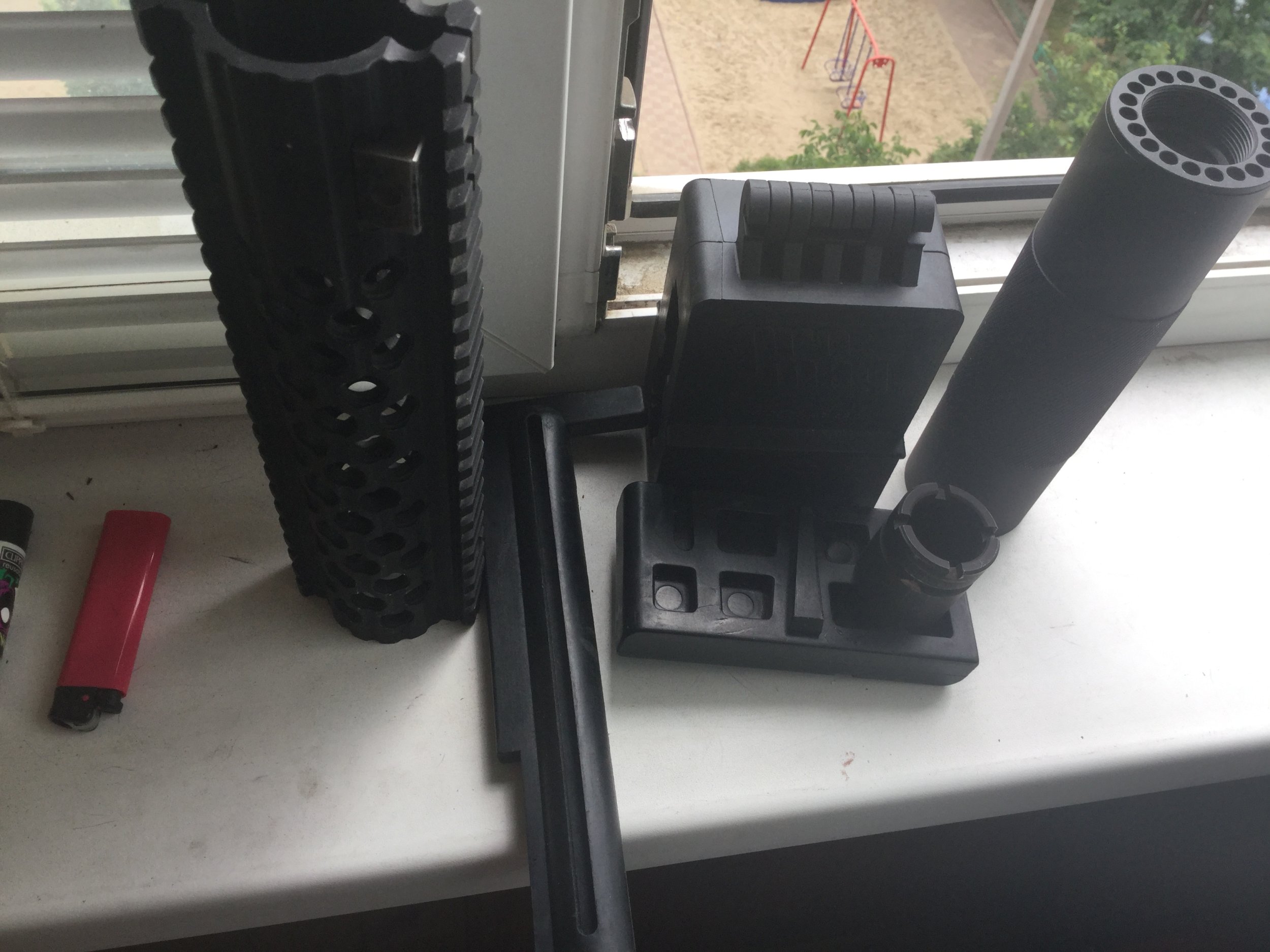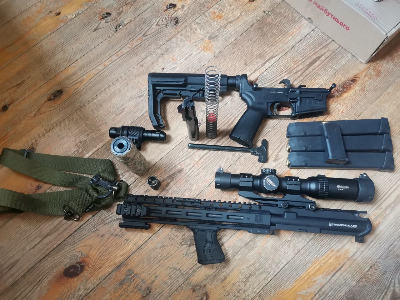 два цевья 9,5 дюймов и 7 дюймов с гайками крепления(ставиться отлично) и комплект для ремонта(открутить ствол, вставка в магазин и аппер), так же два ключа( на фото нет)