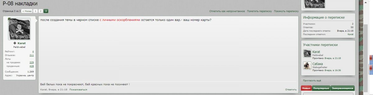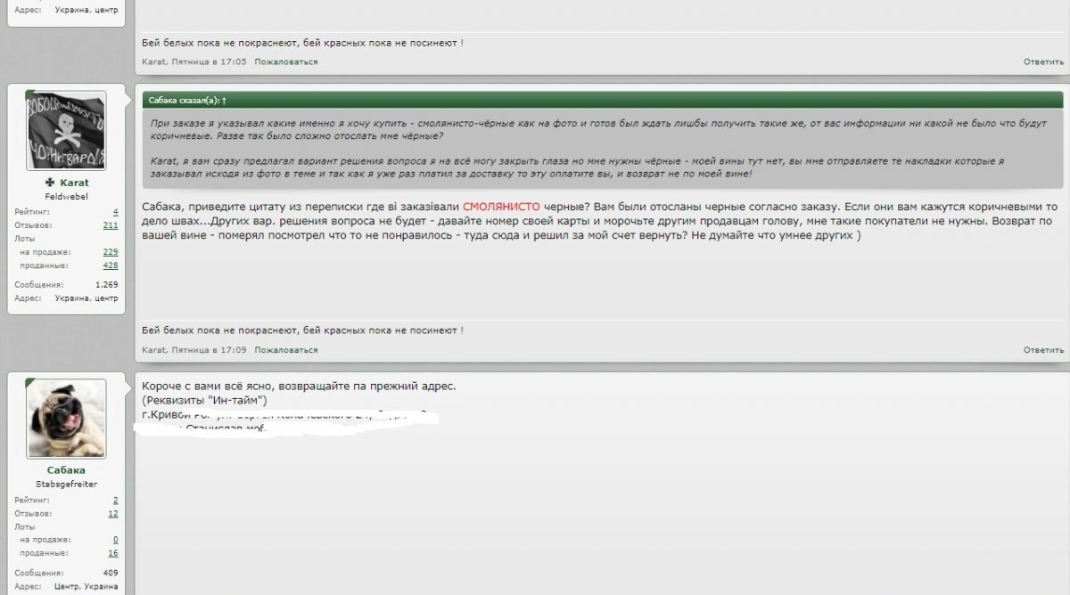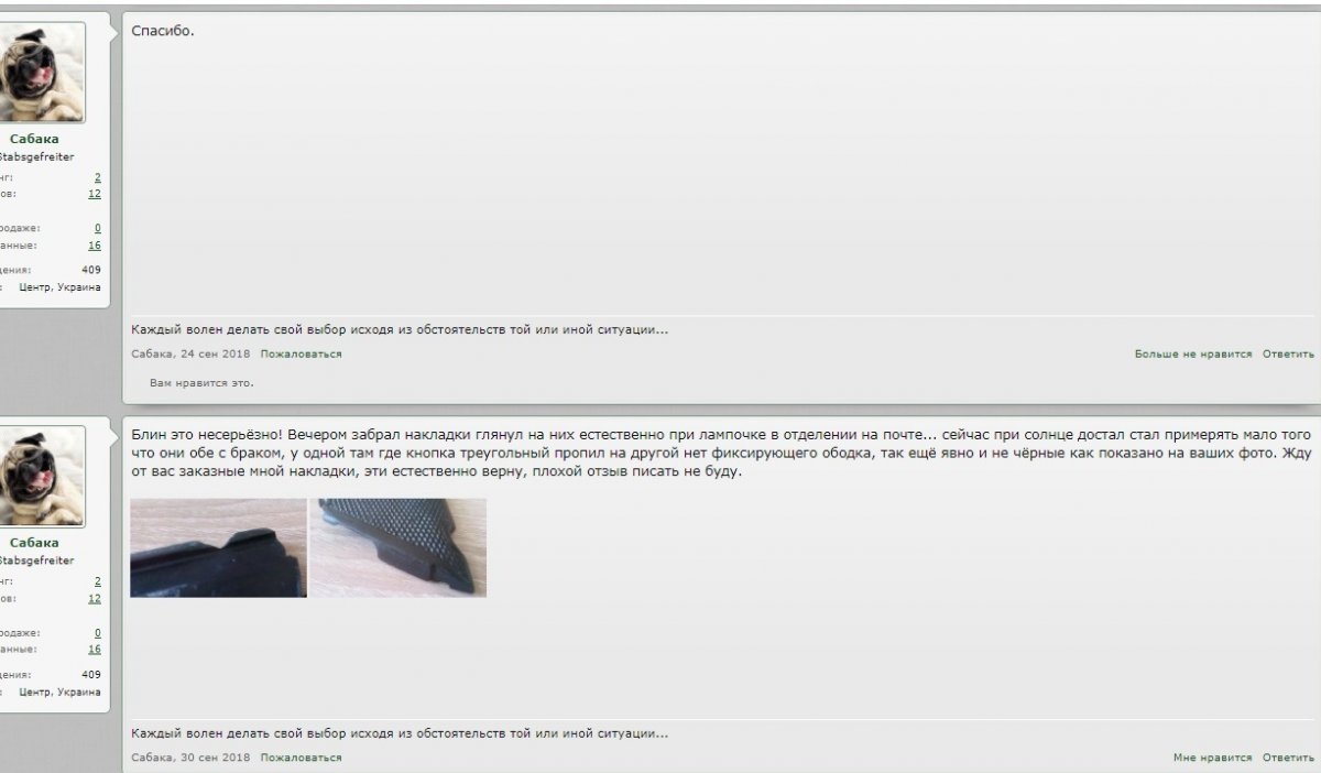 Ув. камрады и прошу помощи у вас и Artemа, в разрешении проблемы с недобросовестным продавцом Karat. Терпел его пол месяца но всему приходит предел! Теперь всё по порядку: Через личку 21 авг 2018 через личку делаю заказ на накладки вар.4 на Р-08. На выложенных продавцом Karat в теме я вижу большие качественных фото, со всех сторон красивые и очень качественно сделанные накладки насыщенного чёрного цвета! Решаю, исходя из увиденного сделать покупку. В личке я указываю какие именно желаю купить а именно левые-чёрные, не коричневые как справа а именно чёрные и прилагаю фото! В ответ: их нет сейчас в наличии будут может через неделю а мож больше... я конечно же соглашаюсь подождать! 21 сен 2018 наконец то получаю в личку - есть пару свободных, я довольный подтверждаю письменно что покупаю такие какие выложены на фото в теме (чёрные вар.4 рис "насечка") и естественно быстренько оплачиваю на карту. 24 сен 2018 от Karat получаю ТТН - как на зло обостряется болячка, но нахожу силы пиляю на почту, 27сен 2018 18:53 (забираю перед закрытием уже темно, надорвал упаковку, глянул вроде порядок) 29 сен 2018 днём дома достал при солнышке глянут и оху... от порядочного продавца, с морем положительных отзывов человек в одно мгновение превратится в какашку. 30 сен 2018 пишу в личку Karat - блин это несерьёзно! Вечером забрал накладки глянул на них естественно при лампочке в отделении на почте... сейчас при солнце достал стал примерять мало того что они обе с браком, у одной там где кнопка треугольный пропил на другой нет фиксирующего ободка, так ещё явно и не чёрные а коричневые. Жду от вас заказные мной накладки, эти естественно верну, плохой отзыв писать не буду. В подтверждении что я не вру скидываю ему фото. В ответ тупо получаю адрес для отправки, ну я человек порядочный, думаю мало ли что может человек занят, отвечаю что хорошо, и уточняю а когда я получу те за которые давно оплачено? В ответ - после возврата. Ну порядок, я решаю что всё решили по совести, всяко бывает и 1 окт 2018 естественно отправил ему обратно! И тут Karat начинает - я еще посмотрю что там за сколы. что то я не видел там никакого брака, посмотрю... и разберусь кто их пилил или ронял или при пересылке сломали... ибо такой брак обоих накладок в одном комплекте такого еще небыло. Это как же понимать я с 21 авг 2018 так ждал эти желанные накладки, зарание оплатил, потом пилял через пол города что бы их забрать... а я теперь типо... дальтоник не отличу чёрный цвет от коричневого и кошу под лгуна?! 3 окт 2018 Справляюсь как обстоят дела а в ответ - что заказанные мной накладки но отправит теперь аж в субботу! А 4-го окт 2018 в личку получаю контрольный выстоел в голову... что вы мне голову морочите - забрал сег. вашу посылку, накладки абсолютно целые и чёрного цвета. Кидаю снова ему фото с его темы - Вот то что я заказывал именно их мне пожалуйста и пришлите, именно их я покупаю, то что выложено на фото в теме, и не коричневые которые рядом а именно насыщенного чёрного цвета, как на фото с лева! (другие покупать естественно не стану) Ответ человек явно без совести и с плохим зрением! - где на тех накладках что вы вернули запилы пропилы сколы и пр. что вы писали обосновывая возврат?Я устал от вашего бреда не меньше вас... 1.Потрудитесь зайти в мою тему продаж и сравнить фото. Они абсолютно одинаковые так как изготавливаются в одной матрице! 2.Оттенок может немного отличатся в зави