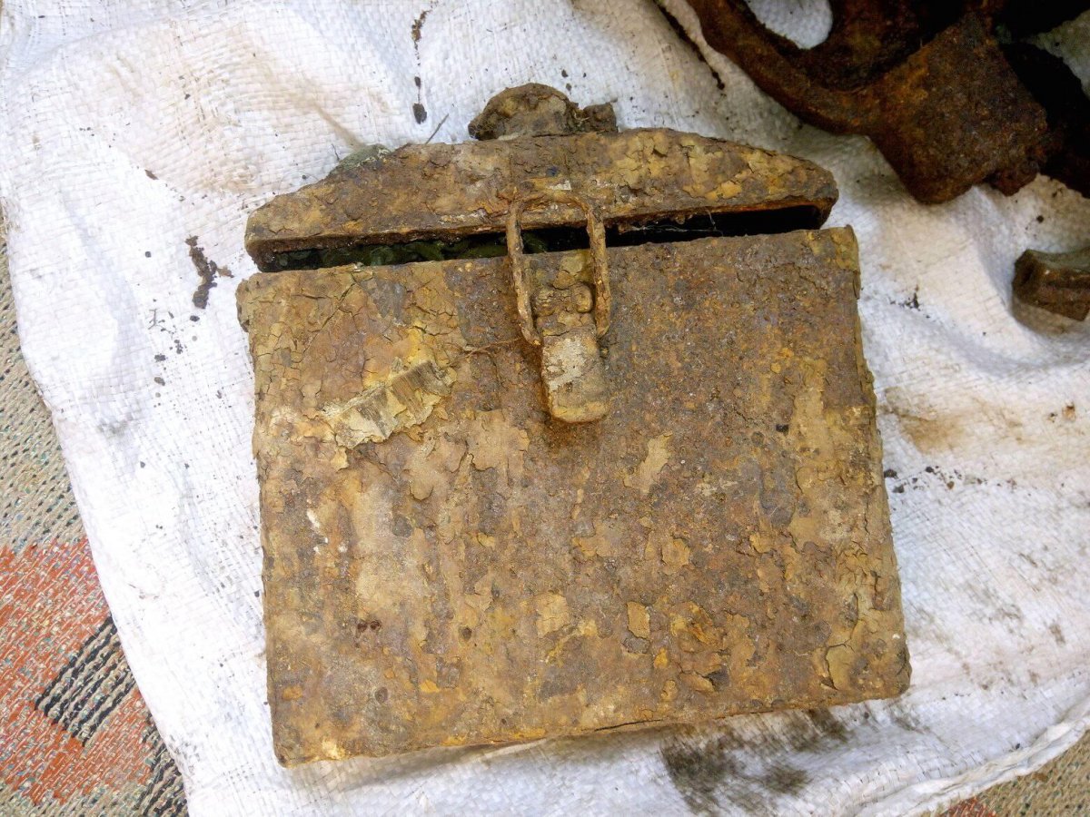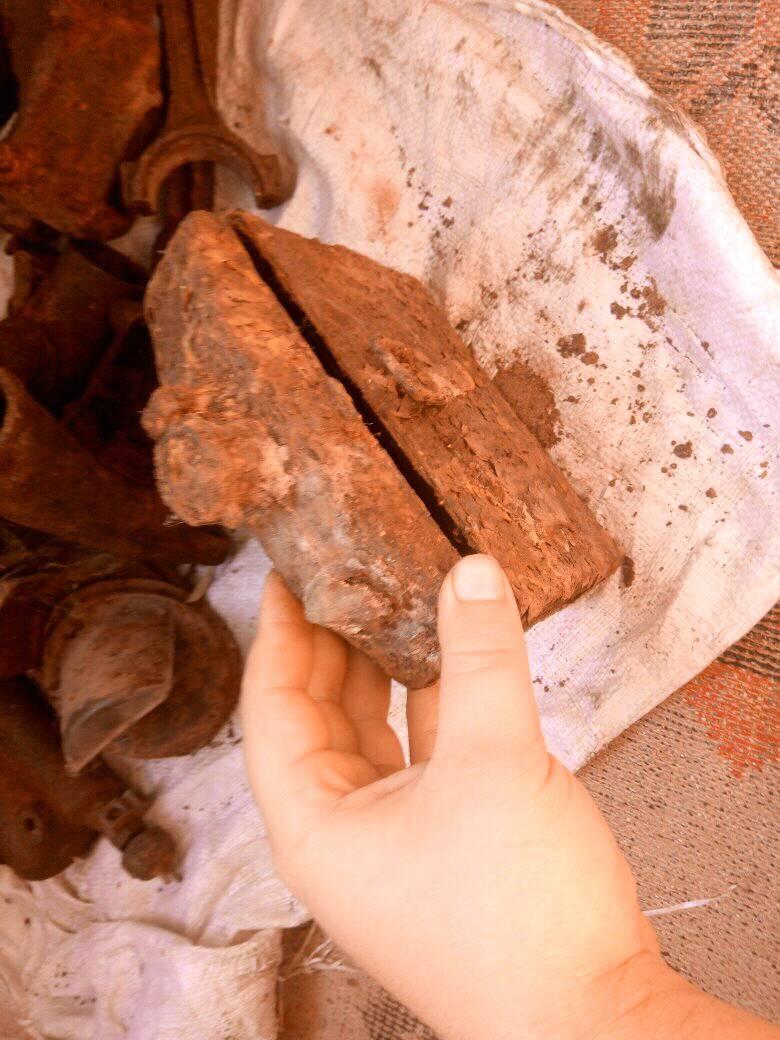 чуть ранее на этом же рембате была поднята яма с изношеными траками от Т-70 среди них было много всяких гаекболтов и прочей мелочи. А также был найдет непонятный большой чугуниевый карбюратор ничего на нем из надписей нет, предполагаю что от того же Т-70 он. Были еще две коробки с резетками и тумблером думаю какие то акумуляторные блоки, но их использовали как емкости с краской. В округе среди резаного тонкого железа пальцев от траков ломаных рессор попали вот такие шильды. Амерские и гансовые.