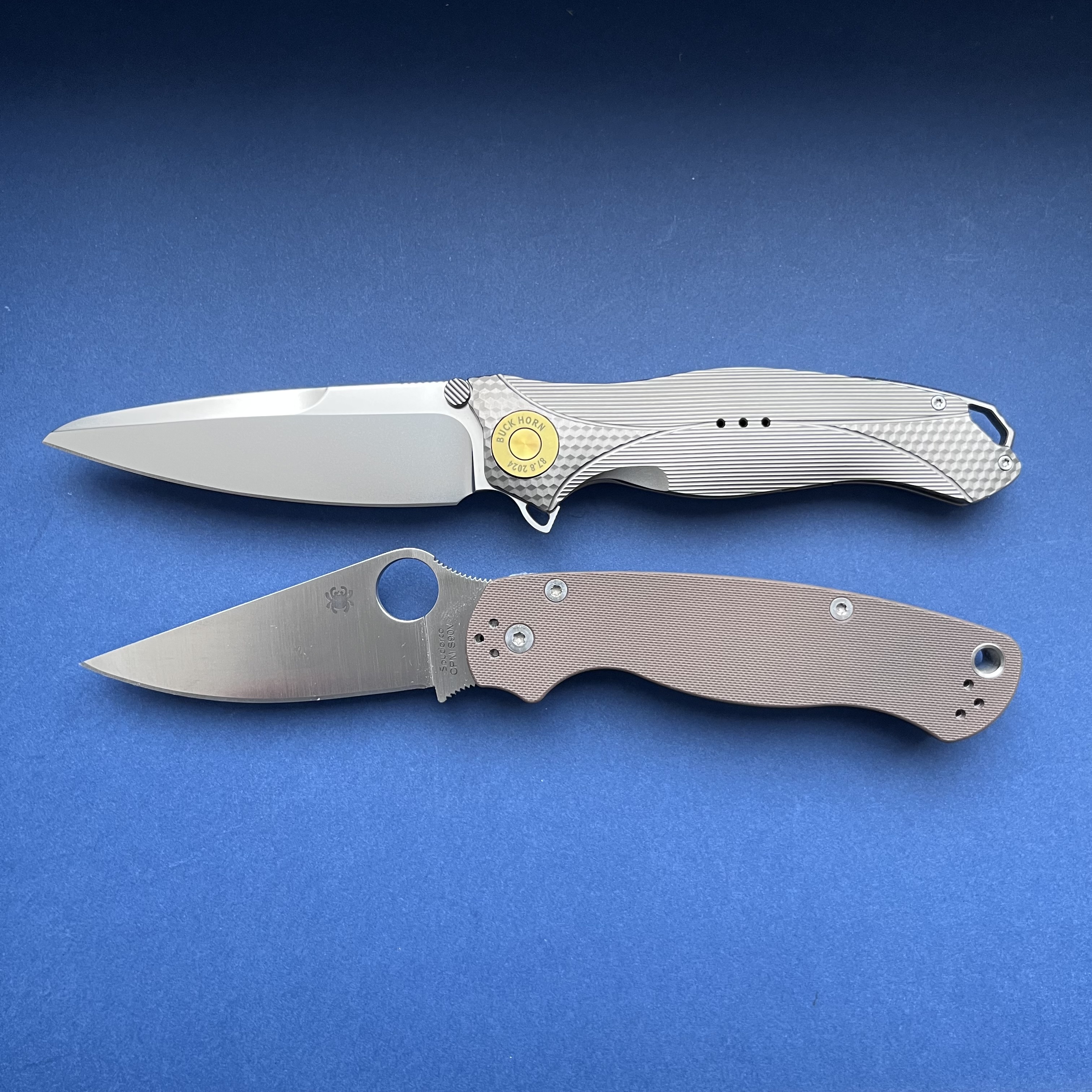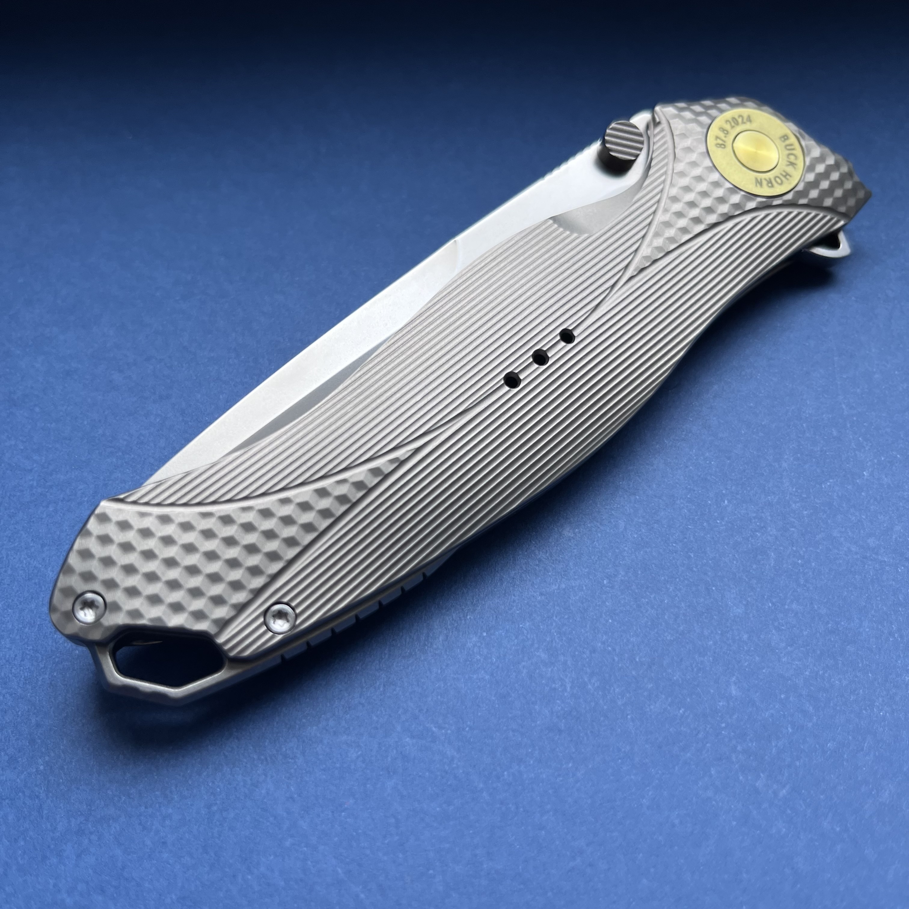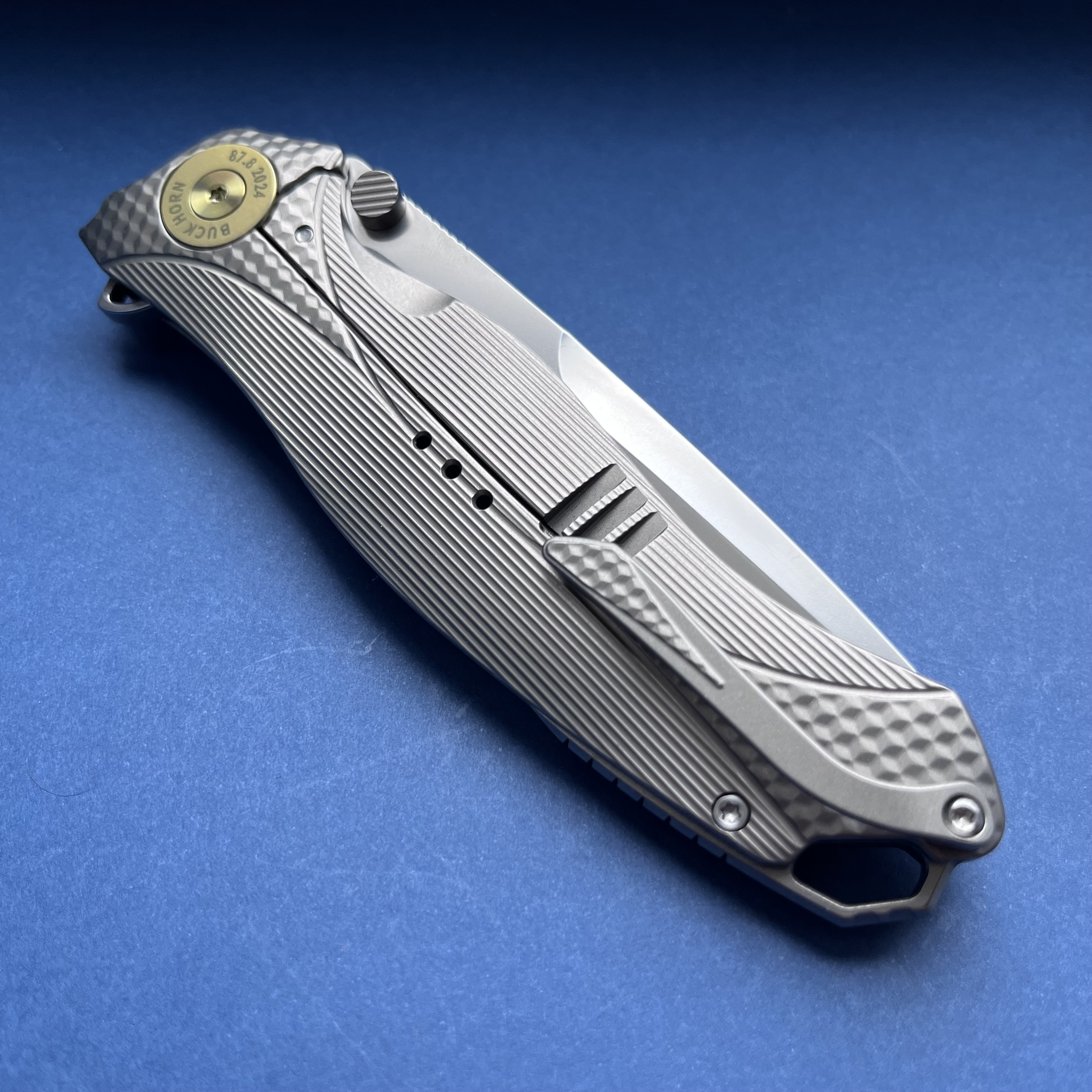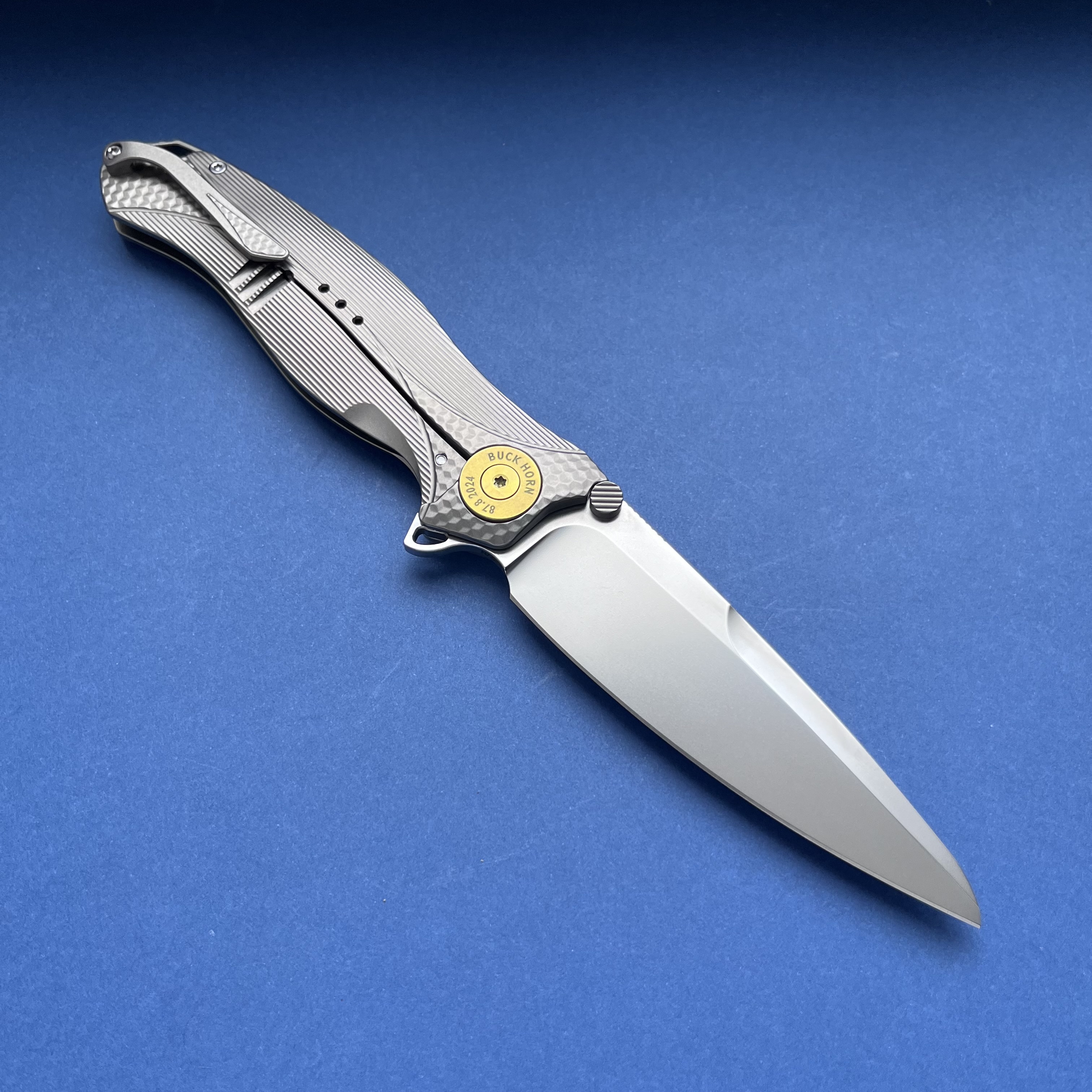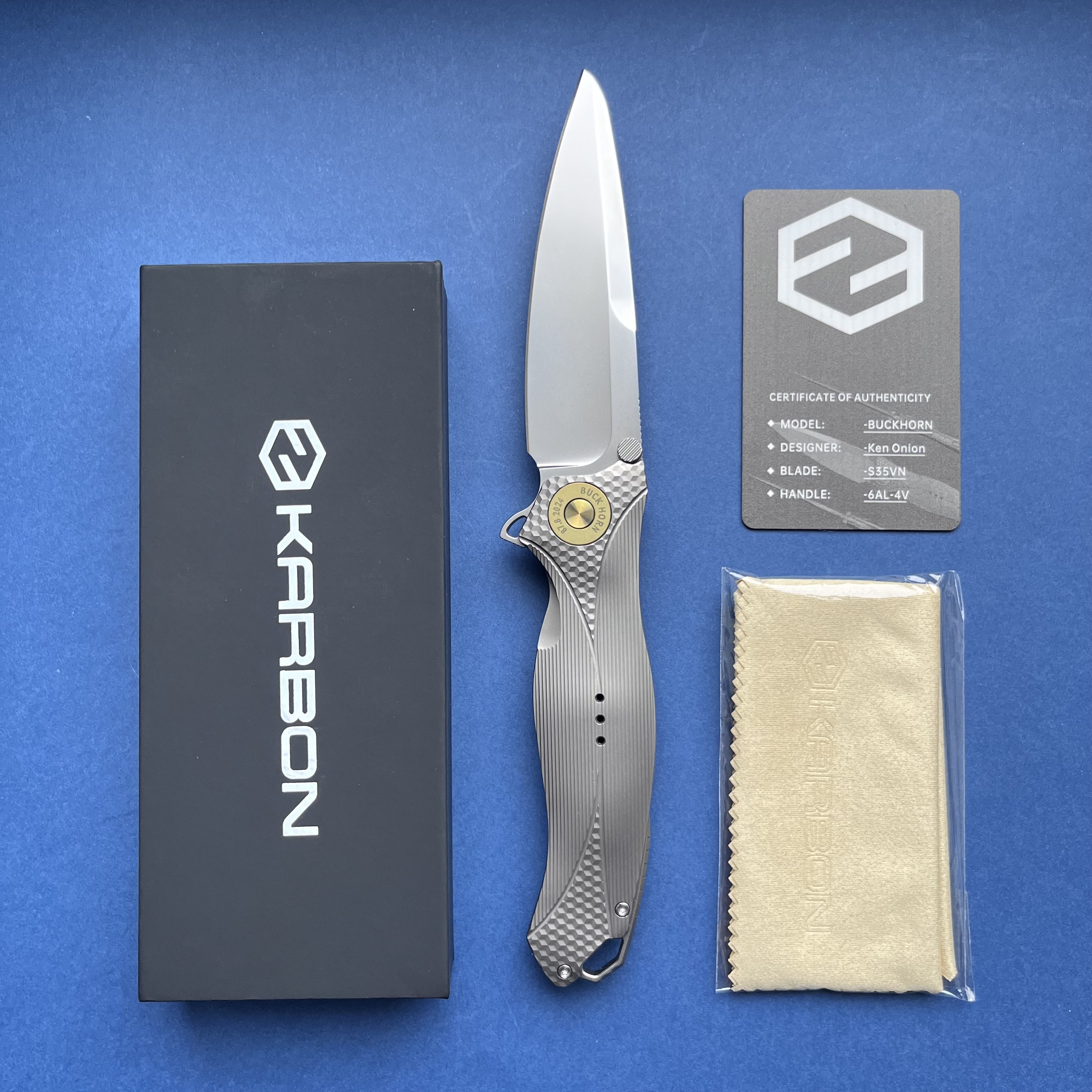 Вітаю спільноту. Karbon Buckhorn Ken Onion Ніж на Atlanta blade show переміг в номінації найкраща колаборція року. Дизайн від Ken Onion, преміальне і дуже якісне виконання, топові матеріали. Чудово налаштована механіка та дітент. Ніж можна довго розглядати і знаходити щось нове. Вісьовий вузол стилізований під капсуль патрону додає цікавих акцентів. Шпеники - відсилка до перших ножів Кена, як і весь дизайн. Фантастична обробка титану. Вживу, ніж виглядає ще краще. Мабуть, один з найцікавіших ножів за останній час. ВІДЕО - Загальна довжина: 223 мм - Довжина клинка: 98 мм - Товщина в обусі: 3 мм - Сталь на клинку: S35Vn - Фініш клинка: bead blast - Руківʼя: titanium - Кліпса: titanium - Вага: 126 г Ціна 310$ за новий ніж