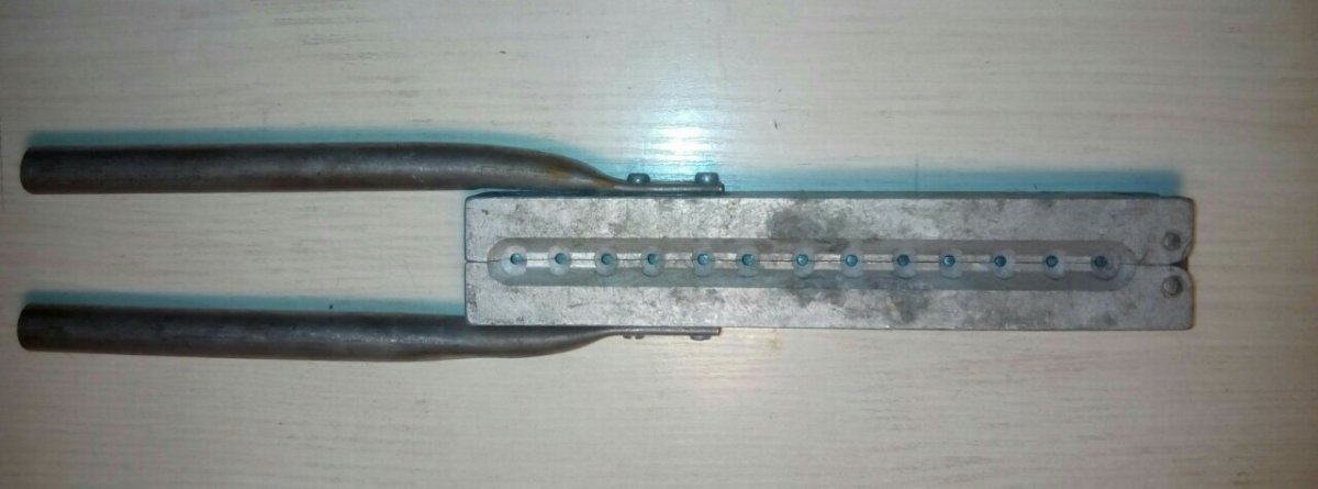 Є в наявності картечелейка. Диаметр шарика 12,5мм. За один пролив получается 13 картечин. Состояние видно на фото. Изготовлена из дюралюмінія. Общая длина с ручками 35 см. Цена 900 грн.