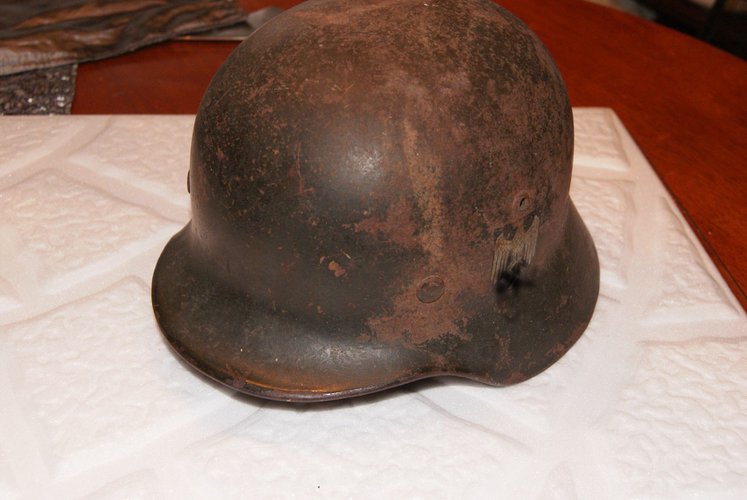 Приветствую! Хорошая реюзная дэка Methner & Bürger. Ставилась на ремонтные шлемы в прифронтовых мастерских. И этот шлем(предполагаю EF) подвергся ремонту(перекрас,новая дэка,подшлем). И снова в бой.