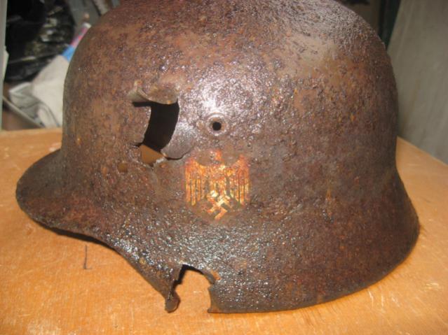 Комрады подскажите стоимость данной каски. Каска М 40, размер по наружным кламерам 65,5 см. Фото сделано по мокрой каске. Состояние на фото, 2 выходных осколочных отверстия.
