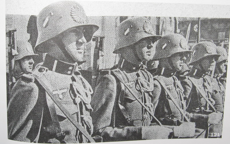 по "Рыцарским кровям" и красоте - полностью согласен австрийцы просто делали для себя похожую внешне версию - с номерами на макушке, и даже иногда с дырками на лбу для кокарды - австрийского орла... (сам держал в руках такую копаную) фото австрийских гвардейцев - вскоре после аншлюса,и присяги фюреру (уже с орлами на форме и декалями Вермахта)
